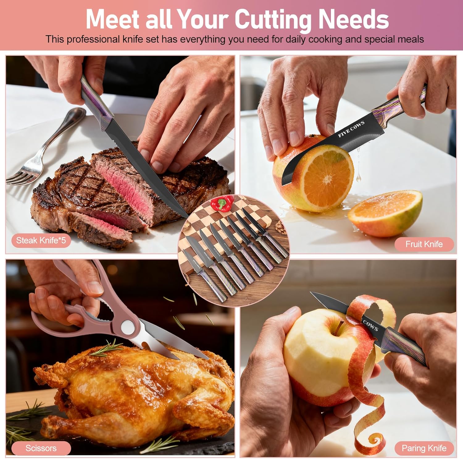 FIVE COWS KITCHEN KNIFE SETS INCLUDE THE FOLLOWING ACCESSORIES