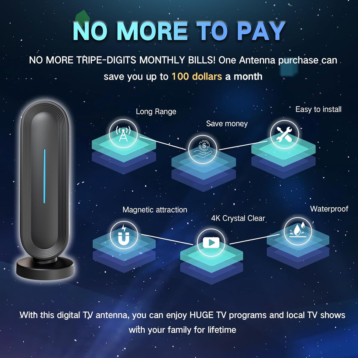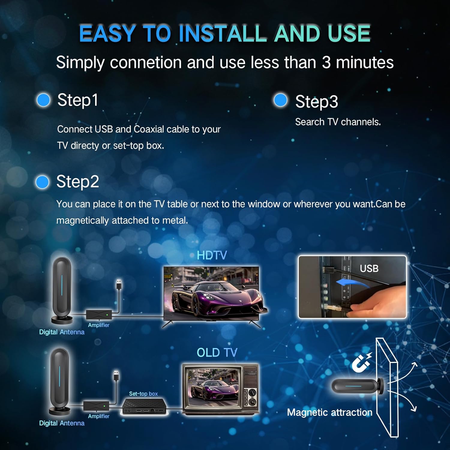 2. Reliable Long-Range Reception The upgraded 2025 HDTV antenna provides stable 360° signal reception. Actual range depends on your distance from broadcast towers and local obstacles such as walls or terrain.