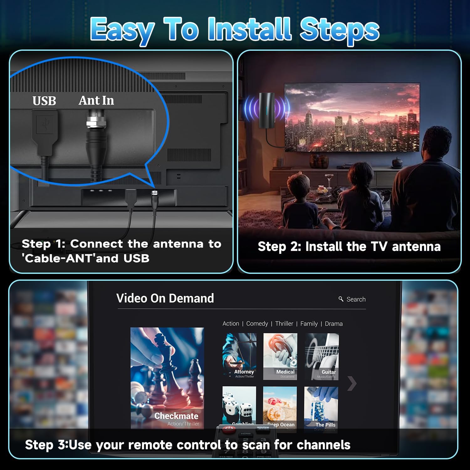 𝐎𝐍𝐄 𝐌𝐈𝐍𝐔𝐓𝐄 𝐈𝐍𝐒𝐓𝐀𝐋𝐋𝐀𝐓𝐈𝐎𝐍: Our indoor antenna for smart tv easy install in ONE MINUTE. JUST 2 SIMPLE STEPS! (1)Connect the coaxial cable to the ANT IN or CABLE IN port on your TV. (2)Configure the antenna with your HDTV’s built-in digital tuner (for traditional TVs, use a digital set-top box) and scan for free local channels.
