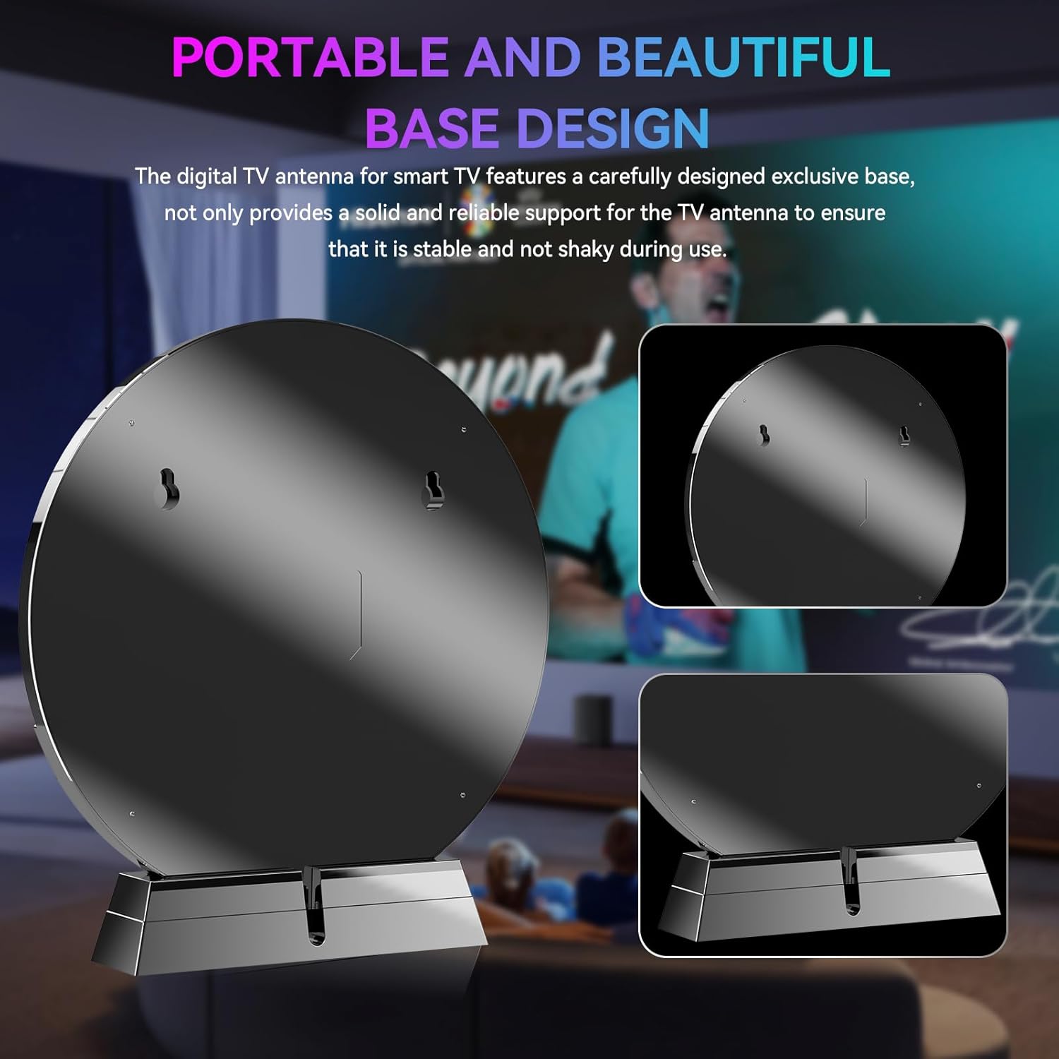 Portable Base Design TV Antenna: The digital TV antenna for smart TV features a carefully designed exclusive base, not only providing a solid and reliable support for the TV antenna to ensure that it is stable and not shaky during use—perfect for both TV antenna indoor setups and occasional temporary TV antenna outdoor placement. It say goodbye to the bulky feeling of traditional TV antennas, ensures you catch your favorite programs, also it adds a touch of modern flair to your living space