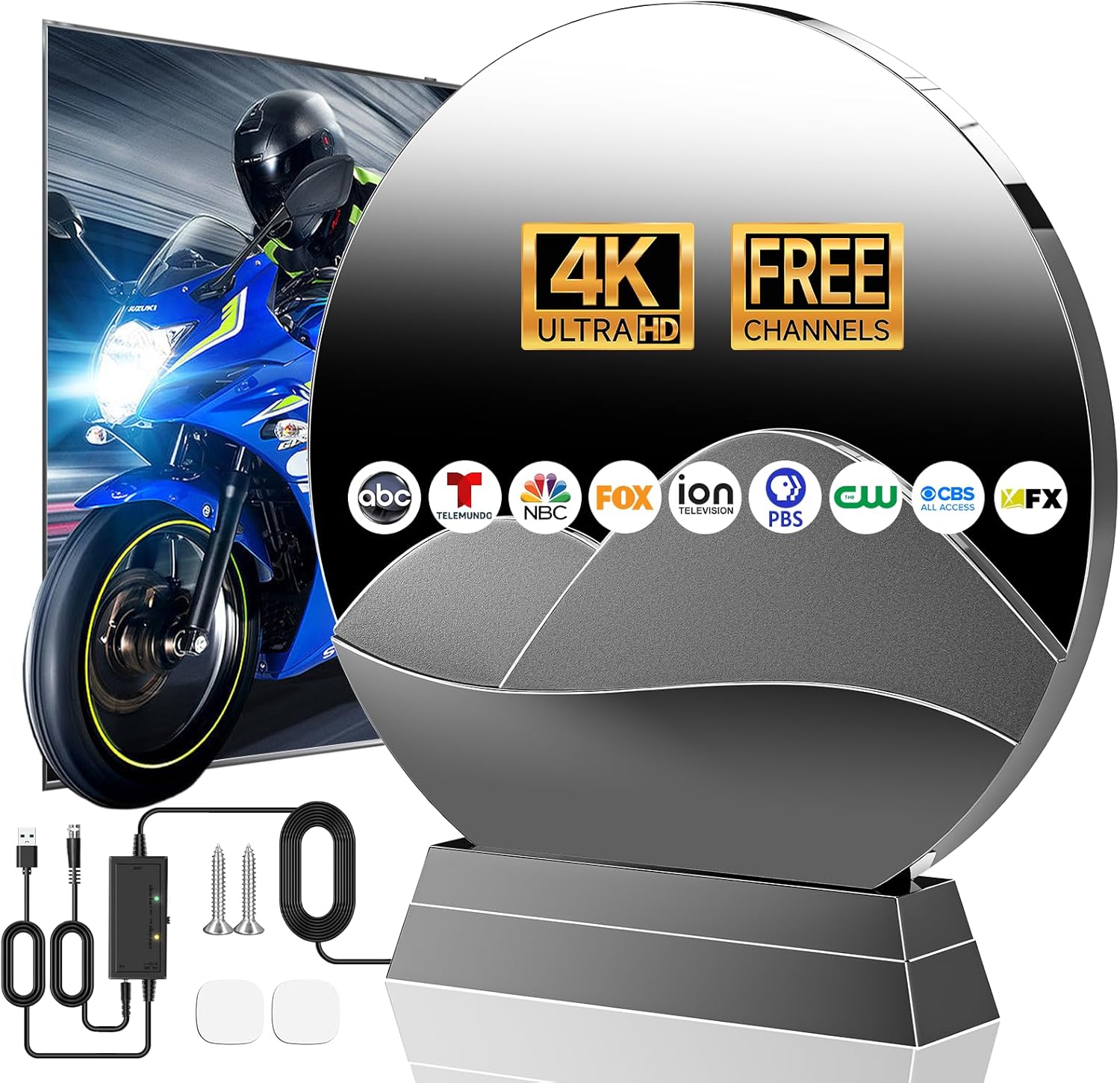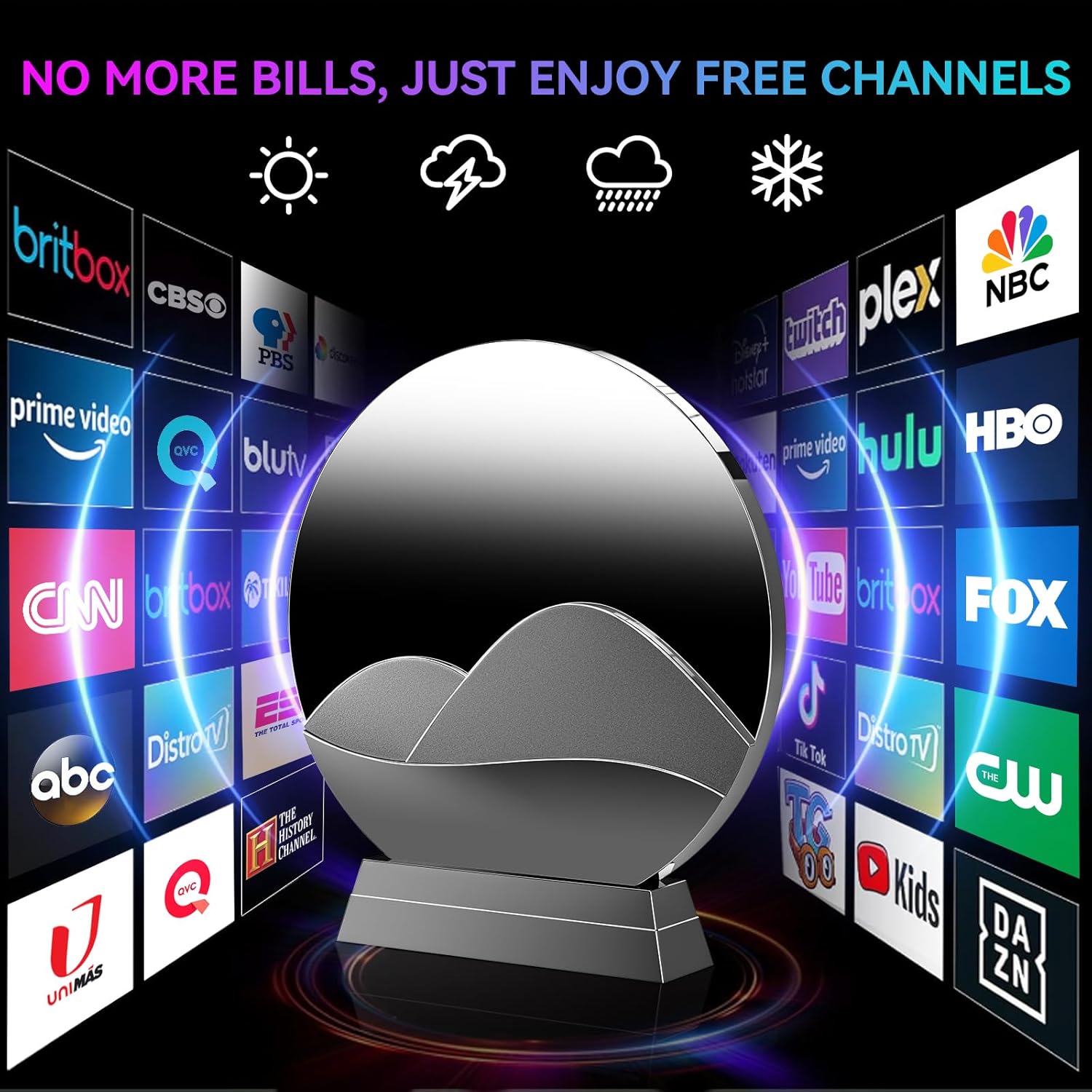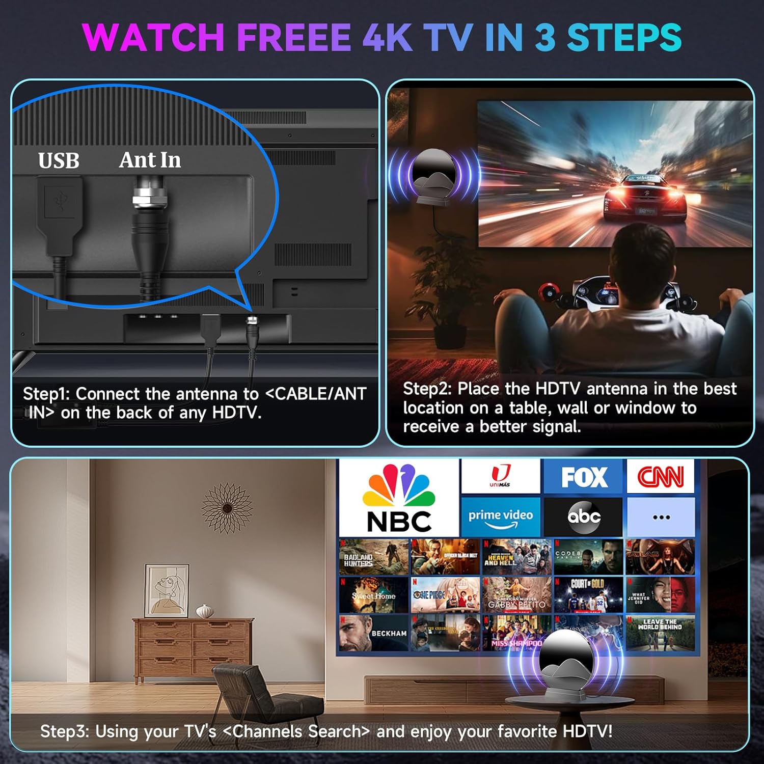 Enjoy Free 4K HD Channels: Say goodbye to expensive cable bills now! Our indoor TV antenna lets you watch free local channels forever. Enjoy popular networks like ABC, CBS, NBC, FOX, PBS and more in clear HD and 4K quality. Watch news, sports, shows and movies without any monthly bills. Supports 4K, 8K, 1080p, and other digital formats