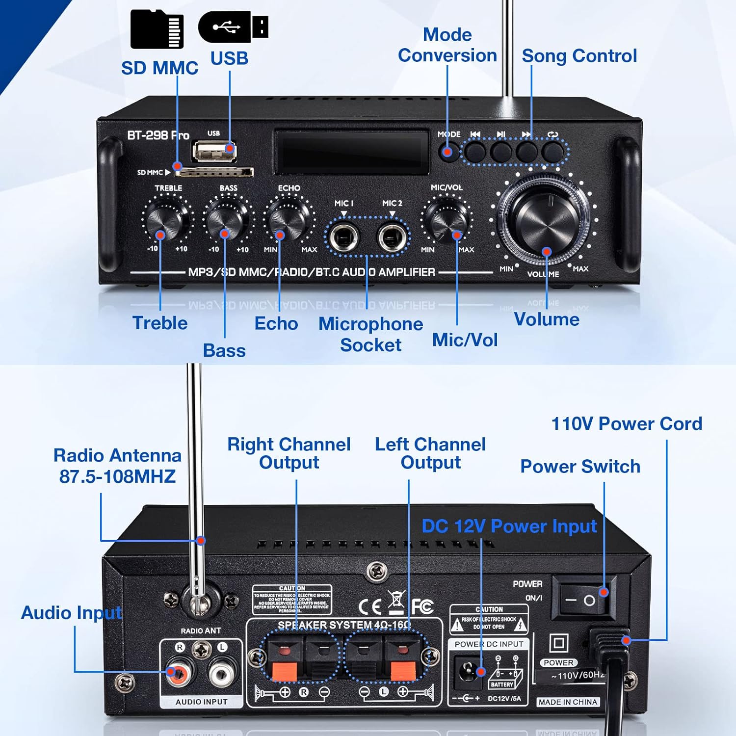 Compatiable Inputs with Bluetooth connection, RCA & MIC Input, USB Port, SD/TF Card & FM RadioMaterial: Aluminum AlloyInput Voltage: AC 110V / 12V DC 5AImpedance: 4-8ΩRMS Power: 50W x 2Peak Power: 400W x 2Resolution: 47KSNR: >92dbDistortion Rate: <0.2%Frequency: 10-20KHzFM Radio Frequency: 87.5-108MHZChannel: 2 ChannelPacking List: 1 x BT-298 Pro Amplifier, 1 x Remote Controller, 1 x User Manual