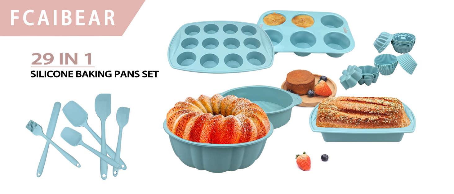 Versatile Set: This 29-piece silicone bakeware set includes a muffin pan, baking sheet, bundt cake pan, 18 mini cake pans, and 6 heat-resistant baking spatulas.