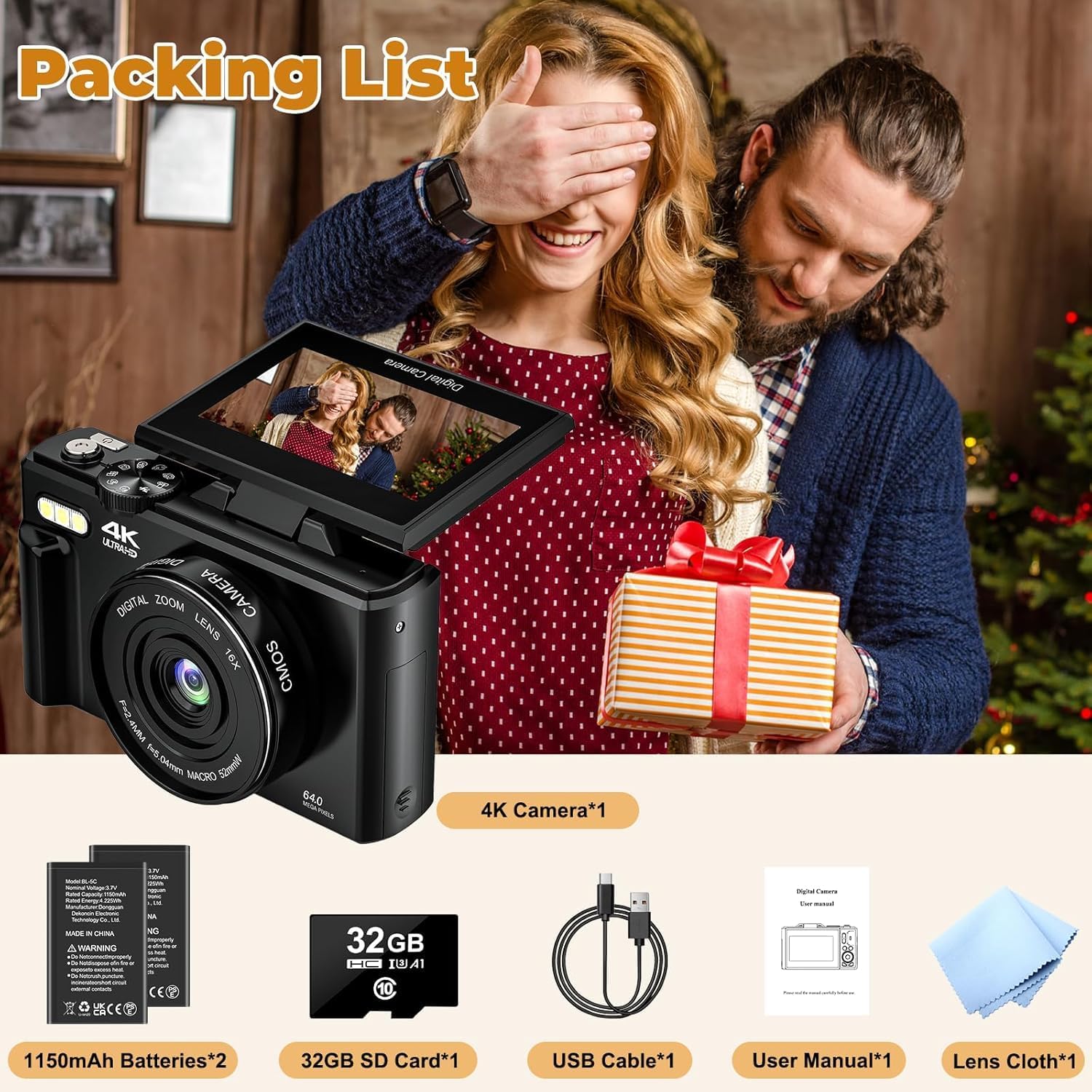 【4K & 64MP UHD Video Camera】This digital camera capture stunning 64-megapixel images and shoot vibrant 4K/30fps video with rich colors and crisp details. Take your photography to the next level with a variety of built-in filters for a uniquely creative experience.
