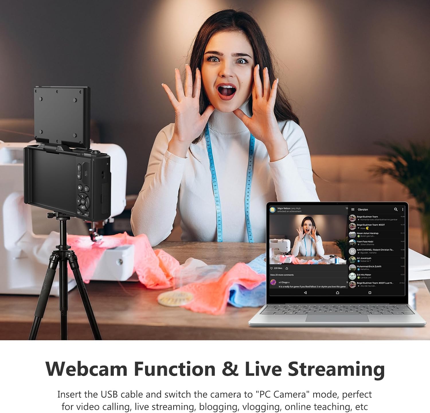 【Vlogging Camera for Youtube as Webcam】This photo camera not only for taking photos and recording videos, but also as a web camera, which by connecting to PC with the USB cable, choosing the “Camera mode”, and equipment with1/4 standard size tripod screw