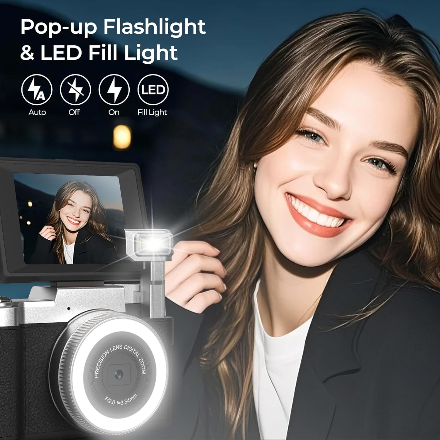 [ Pop-up Flashlight & LED Fill Light ] – The photography camera with two light system, pop-up flashlight and LED fill light, which providing the best solution in dim light conditions. When your vision is limited in a dark environment, you can set the flashlight or LED selfie light turn on to get a brighter view.