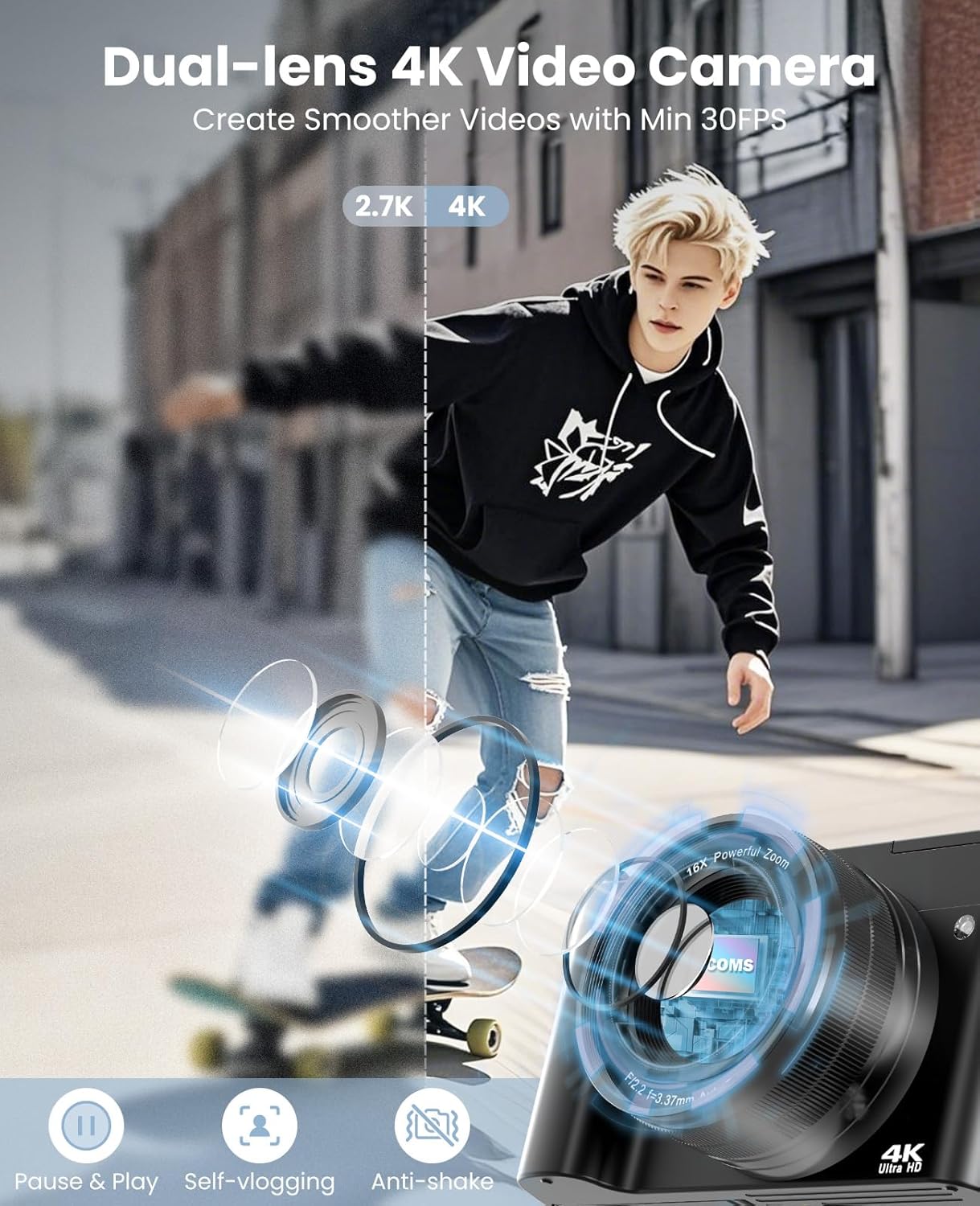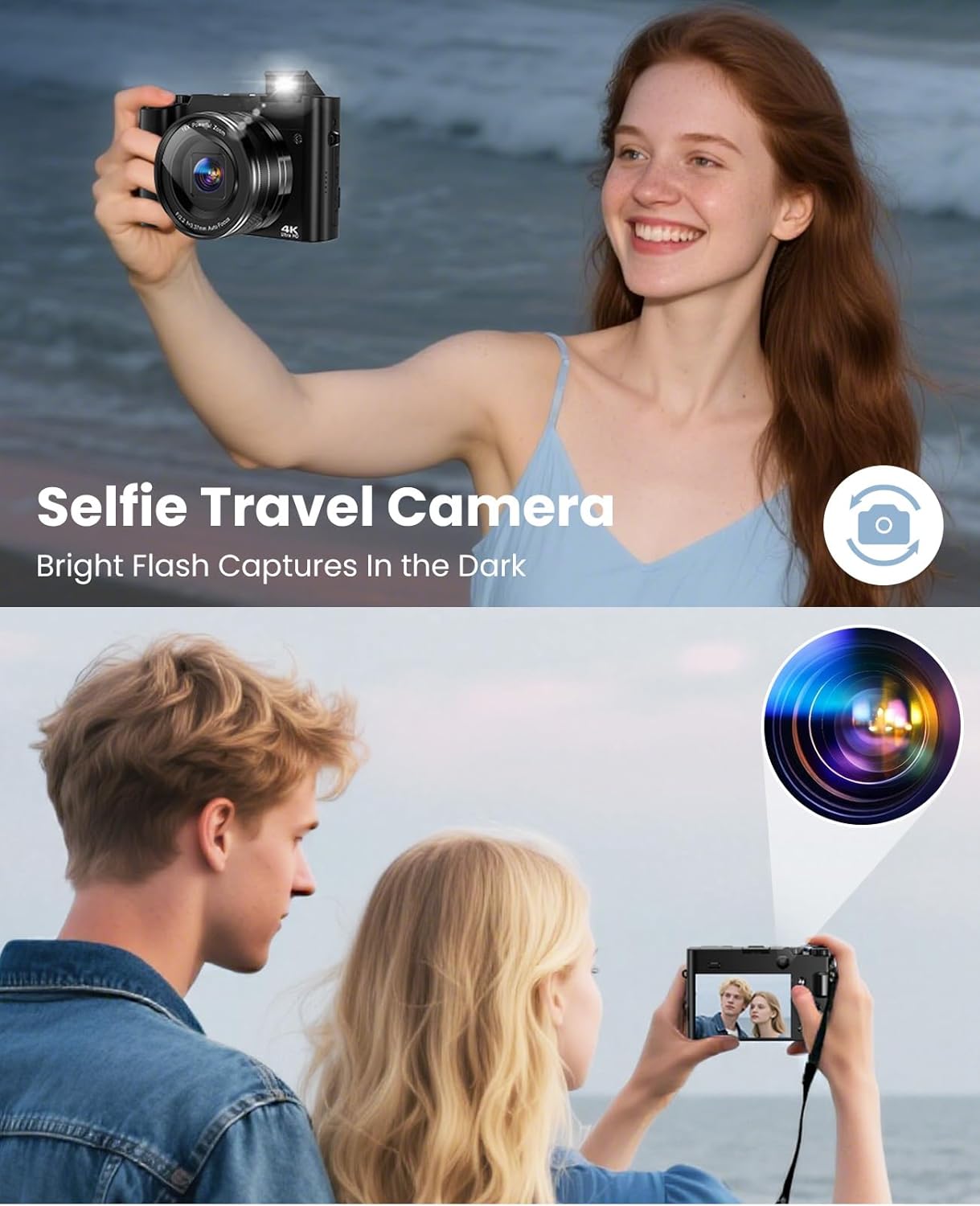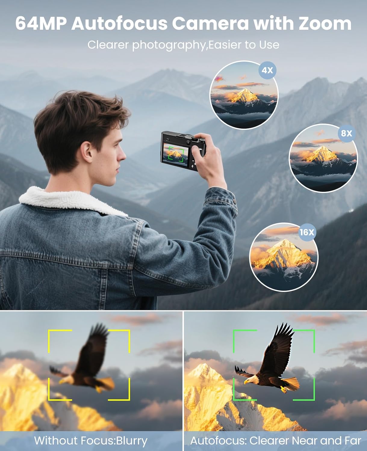 Advanced Dual-lens Autofocus Camera – Front and rear cameras meet selfie needs, allowing for quick selfies with friends or alone while traveling; 4K digital camera with autofocus and 16x digital zoom can capture distant and macro landscapes clearly; The photography camera features a 3-inch IPS high-definition screen, along with a simple user interface and mode dial, providing convenient shooting settings and quick access. Professional digital camera can be simple and easy to use!