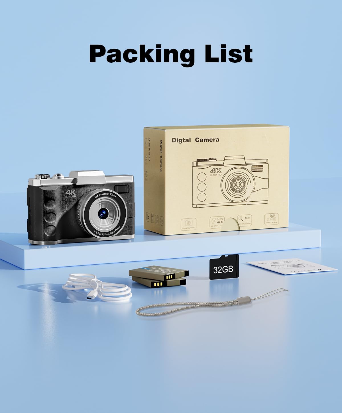 【A Perfect Gift – Fully Equipped Camera Kits】Fashion 4k digital camera for beginners and teens is full-featured and easy to use! This compact 4k camera is the perfect gift for yourself, lovers, friends, children, or parents for Valentine’s Day, Thanksgiving, Christmas, and birthday day! The travel digital camera comes with Digital camera*1, 32GB card * 1, battery * 2, Type C Cable * 1, Lanyard * 1, Camera bag * 1, Manual * 1.
