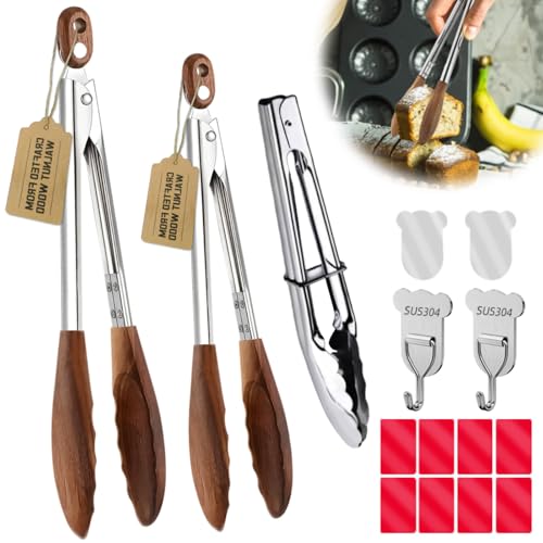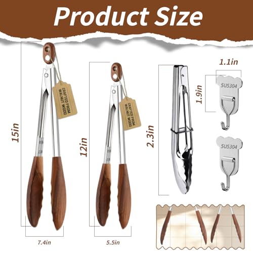 New Wooden Tongs for Cooking:Our Salad Tongs set contains 2 walnut wooden kitchen tongs, 15″ and 12″, 1 small stainless steel food tong and 2 stainless steel hooks,tongs set a must-have for your kitchen