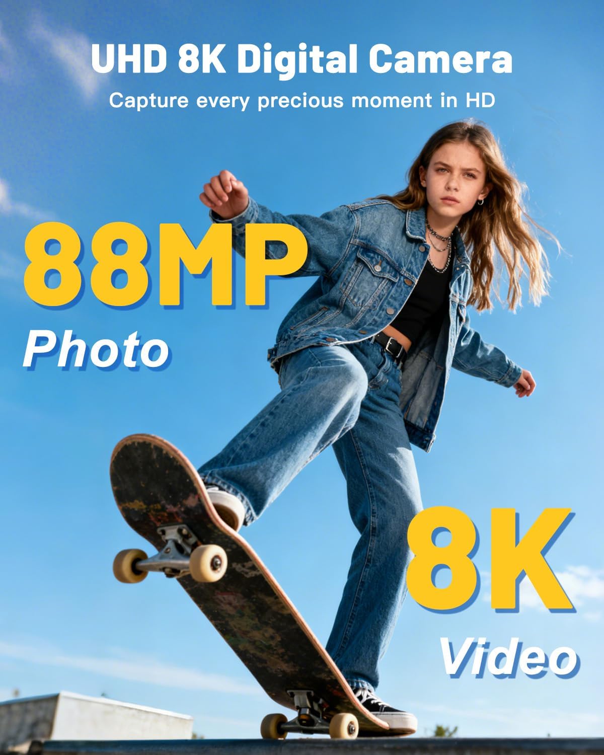 【8K UHD VIDEO & 88MP PHOTO】The digital camera boasts stunning 8K video recording capabilities and an 88MP sensor, ensuring photos are crisp and vibrantly colored. Whether capturing fast-paced action or low-light scenes, the built-in image stabilization ensures smooth, clear footage. Additionally, this vlogging camera comes with a 64GB card, allowing you to store countless photos and videos. This 8K camera is the perfect choice for travelers, vloggers, and creators, delivering a professional-grade imaging experience with ease.