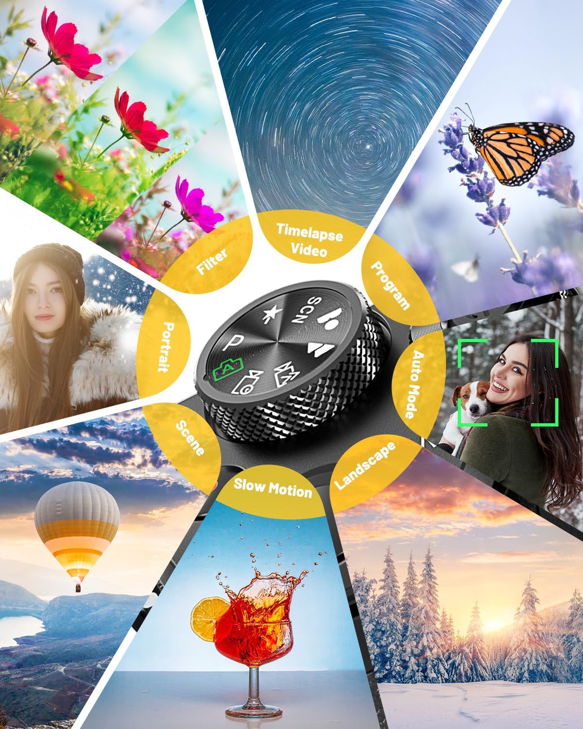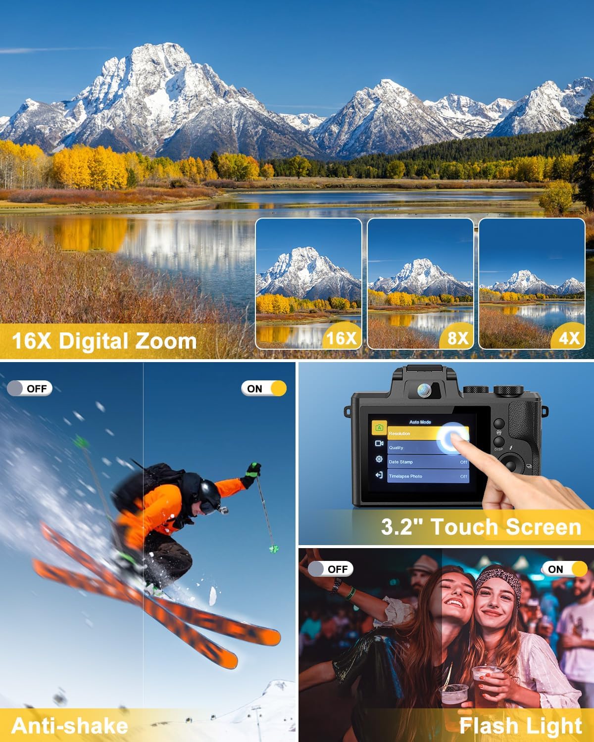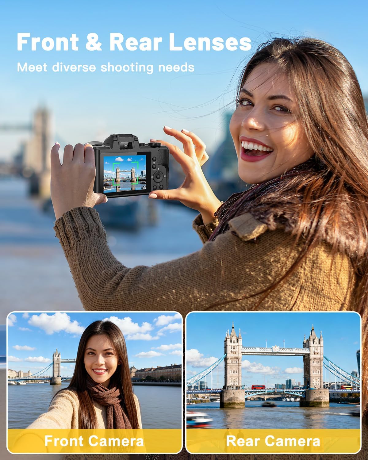 【DUAL-LENS & AUTOFOCUS & 16X DIGITAL ZOOM】The cameras for photography features dual lenses, making it equally adept at capturing landscapes and portraits. With its autofocus function, it quickly and accurately locks onto your subject, ensuring you never miss a moment. And the 16x digital zoom lets you capture sharp, detailed images even from a distance. Whether you’re traveling, shooting sports, or capturing everyday life, this photography camera delivers a perfect shooting experience with professional-grade results.