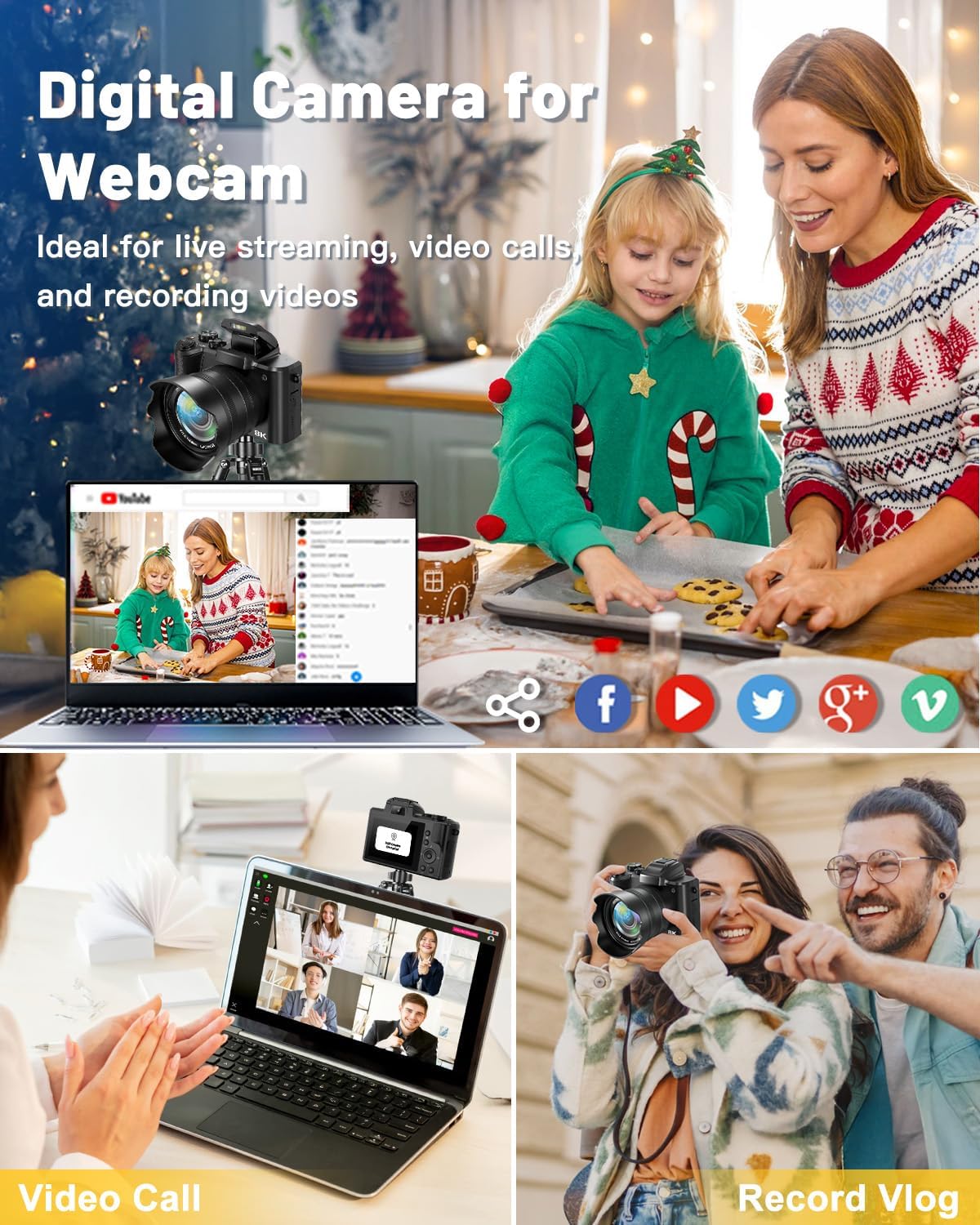 【WEBCAM FUNCTION & 3.2″ TOUCH SCREEN】The vlogging camera for YouTube doubles as a webcam for live streaming on Facebook, Zoom, or YouTube Live. The large 3.2-inch touchscreen makes framing shots, navigating menus, and reviewing photos effortless through intuitive taps and swipes. Whether you’re vlogging, video conferencing, or capturing everyday moments, this 8k digital camera for photography seamlessly blends versatility with user-friendly controls for a smooth creative experience.