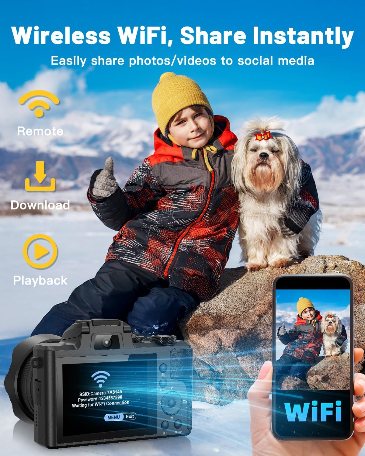 【WIFI TRANSFER, INSTANT SHARING】The 8K digital camera features built-in Wi-Fi, allowing you to effortlessly transfer photos and videos to your smartphone for easy sharing on social media and cloud backup. Say goodbye to messy cables and long waits. When you want to relive those special moments, simply use the HDMI output port to display your content in crisp HD quality on any HDTV or large screen. This professional camera is perfect for family movie nights or photo presentations, allowing you to share instantly or enjoy your cherished memories on the big screen.