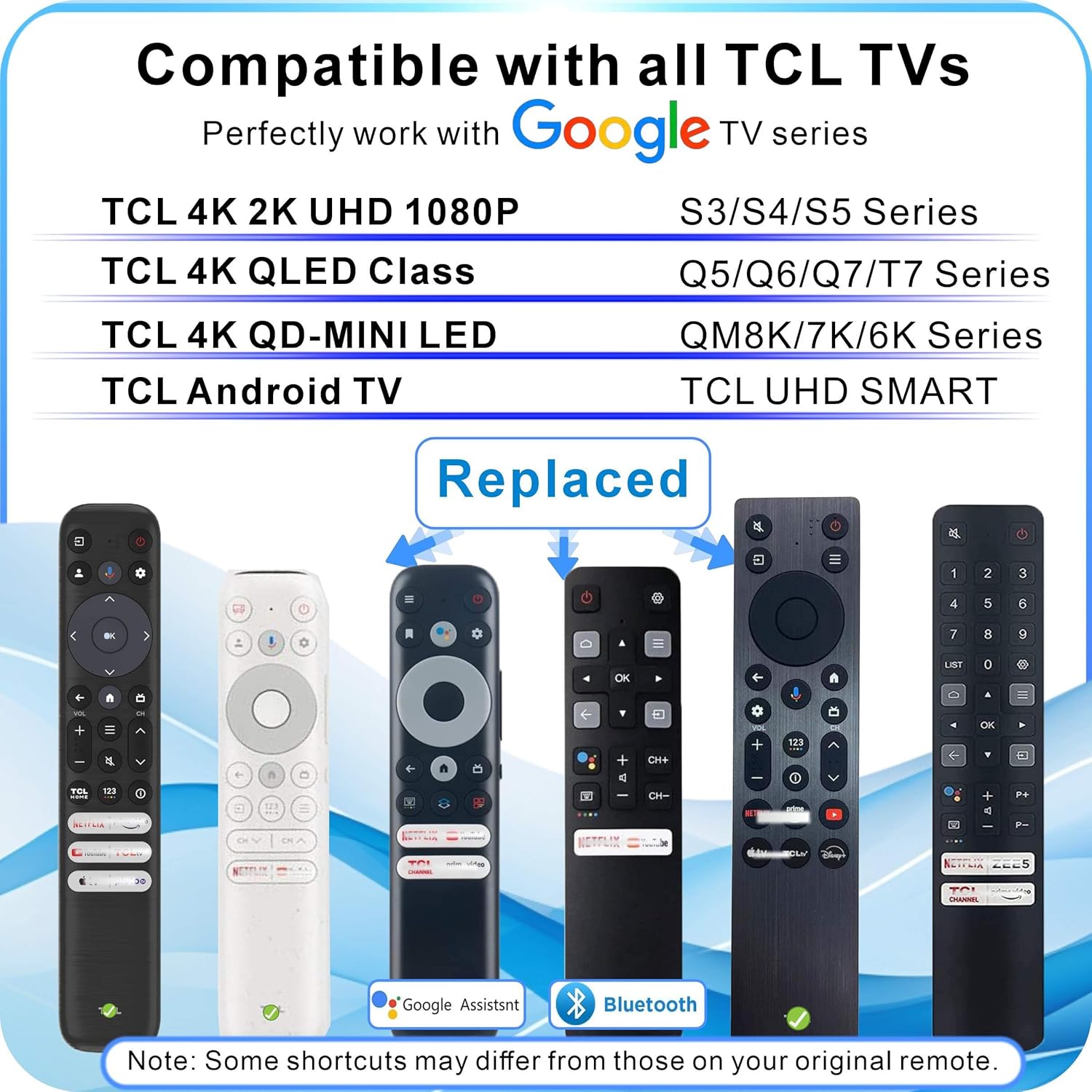 Compatible with TCL Google TV Series: S3, S4, S5 Q6, Q7, Q8, QM6, QM7, QM8Compatible with Fire-TCL Smart-TVs.The pairing methods vary for different TV systems. Please refer to the manual for specific instructions.