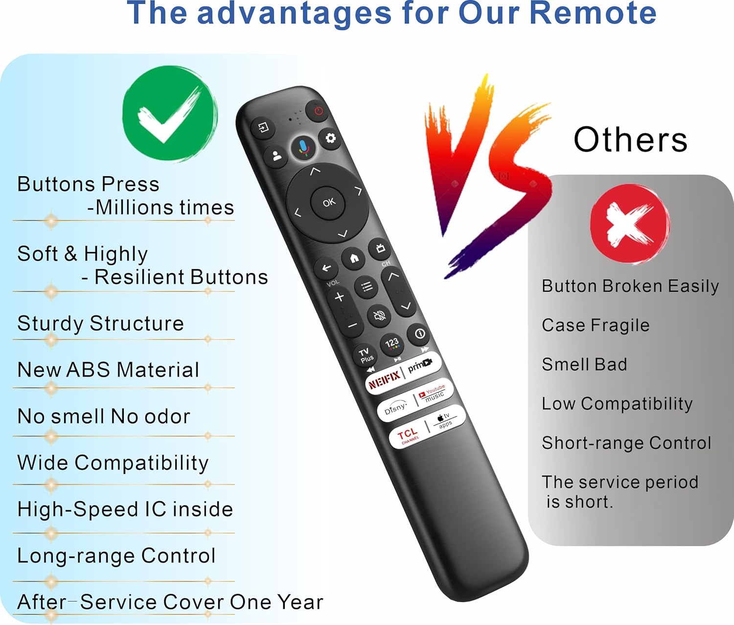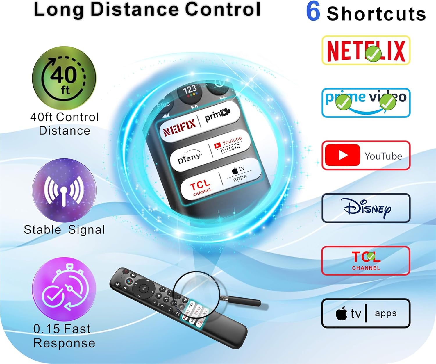 Universal Voice Control Smart Remote for TCL & More: Unlock voice command features on compatible TCL TVs! If your TCL TV has Bluetooth hardware (4.0+/5.0+/5.3+), this remote upgrades your infrared-only original remote to full voice-control functionality. The pairing method varies by TV model