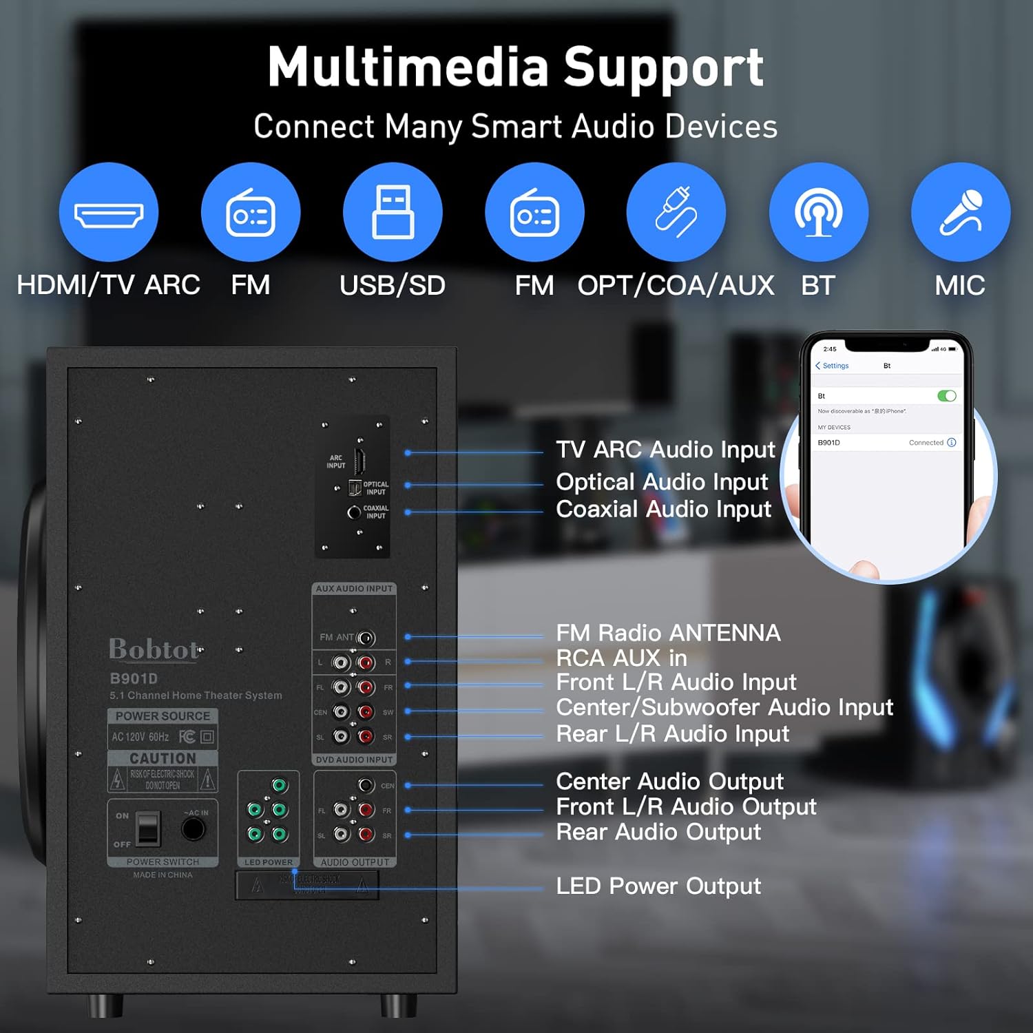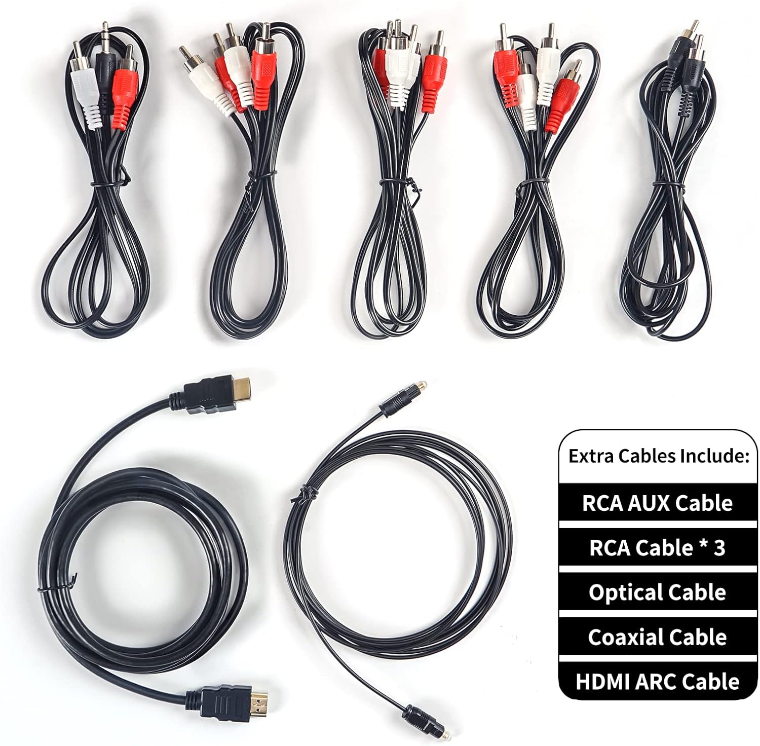 Multimedia Support: The home surround sound speakers support various smart devices. 5.0 Bluetooth supports directly connecting with Bluetooth devices; It’s also compatible with HDMI/OPT/COA/AUX/USB/DVD audio sound inputs. Additional cables include HDMI ARC Cable/Optical cable/Coaxial cable/AUX cable/RCA cable/Antenna cable supports any application in need