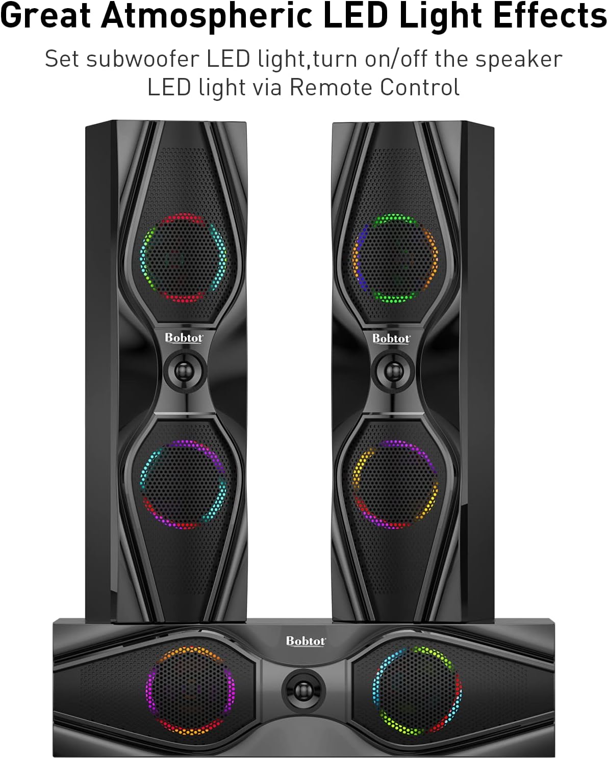 Great LED Ambient Light Effect: The surround sound system speakers use high-quality materials, with LED lighting effect which makes full of atmosphere. The Subwoofer unit has 4 LED lighting modes: (blink to the beat, solid on, spectrum EQ analyzer, off).