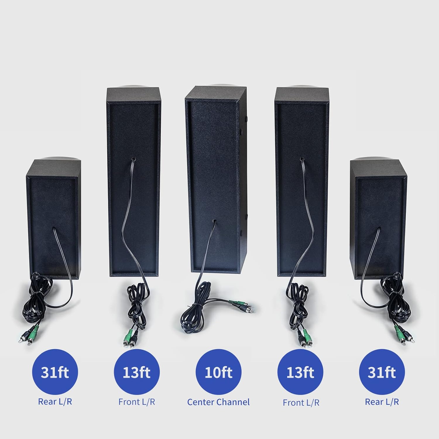 Long Built-in Cable Connection: Wired connection between the small speakers and the subwoofer(not wireless), with long enough built-in cable, the speakers can be placed anywhere: Front Speakers L/F: 13Ft, Rear Speakers L/R: 31Ft, Center Speaker: 10Ft