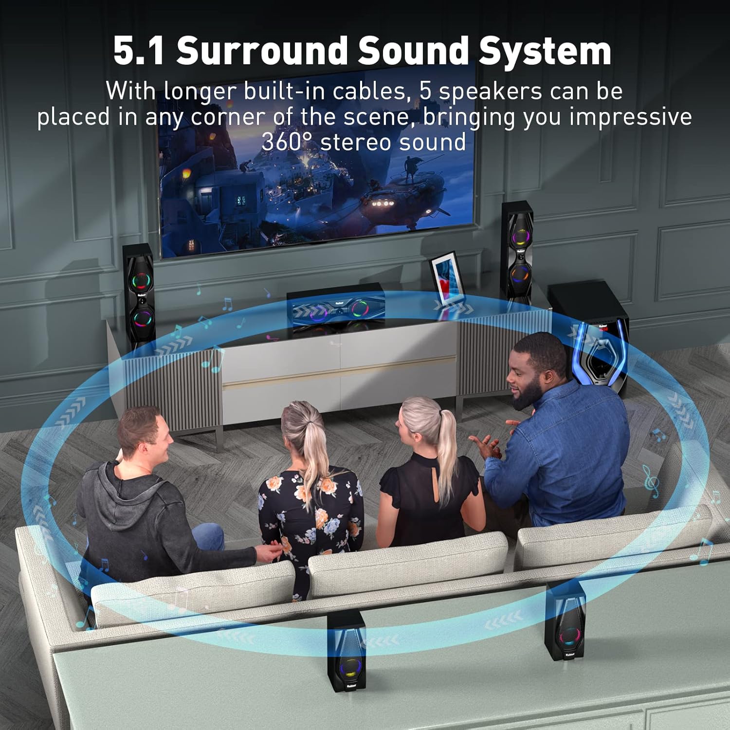 5.1 Channel Surround Stereo: Stereo system speaker has two modes of 5.1/2.1 channel, switch via remote control or front panel of the subwoofer. Pro surround function provides you with more advanced enjoyment.