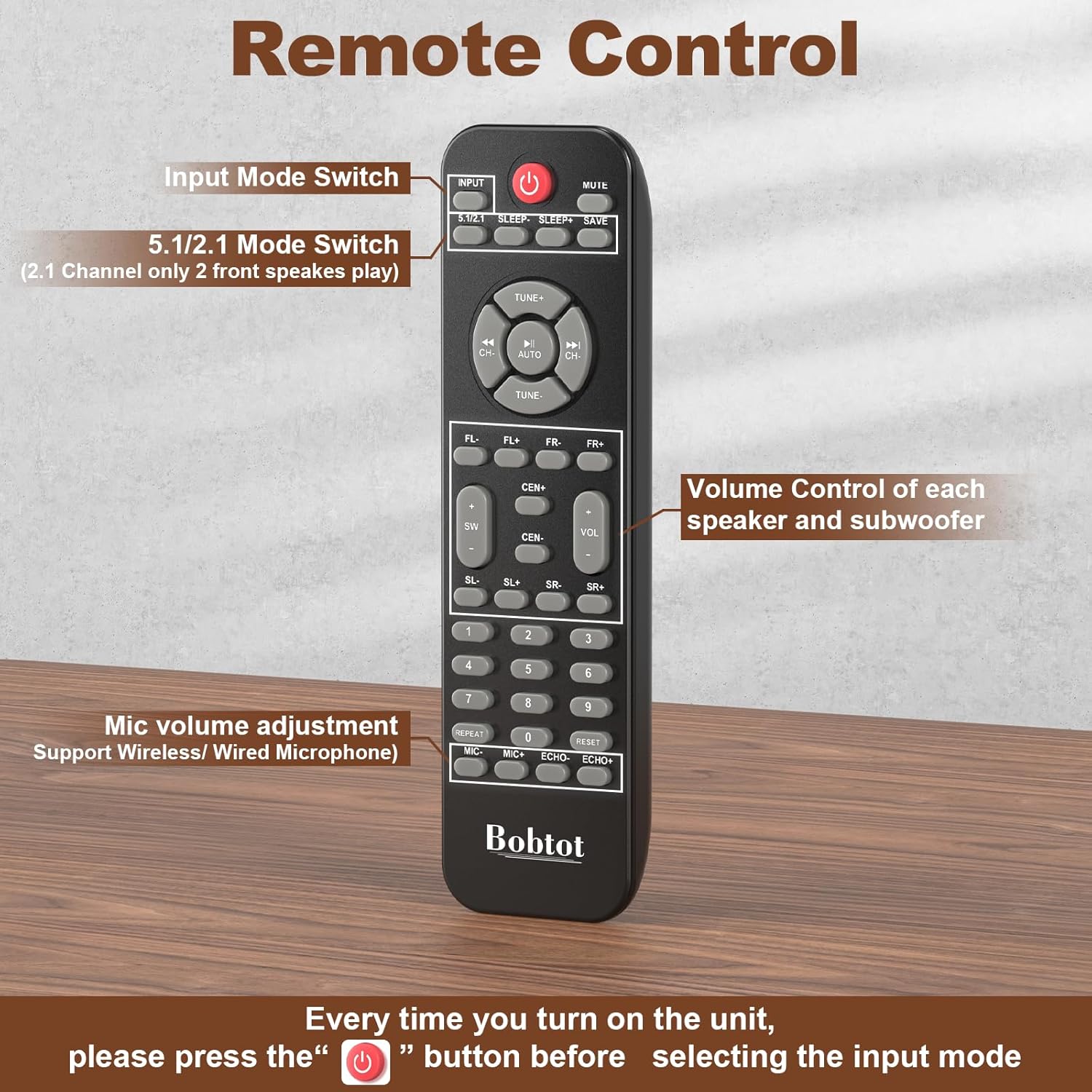 5.1 Channel Surround Stereo Sound: Bobtot surround sound system has two modes of 5.1/2.1 channel, switch via remote control or front panel. Pro surround function provides you with more advanced enjoyment. Via the Remote you can also independently control the volume of each speaker and the subwoofer.