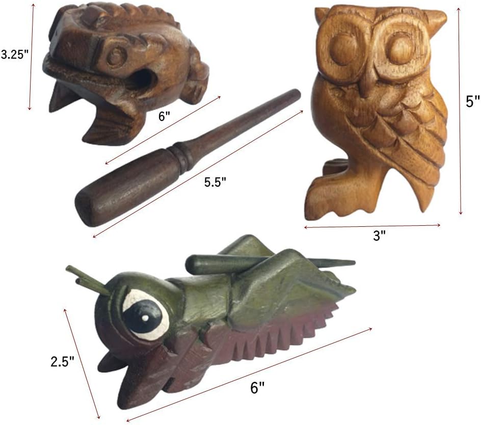 Set 3 Animal Musical Instrument Wooden Percussion Frog, Cricket and Owl Traditional Craft Wooden Luck Money Frog Home Office Decor Art Figurines Ornament Meditation Relaxation . The cricket makes a sound that resembles a cricket, the frog does sound like a frog, and the owl does make a hooting sound. When you sweep the frog’s back or the cricket with a stick, they sing very eadily and produce rich, harmonic and soothing sound immediately. There is a hole for blowing into the owl producing lovely high-low sounds. It would produce Owl’s sound like 00-oo- hoo-hoo-hoo-hoo-oo-00. They can be used as a ornaments also used for meditation, music, relaxation, etc. Great gift for children ,friends,home , office etc. INSTRUCTIONS: Use the wood stick (included) to gently rake up the frogs back to create a high-pitch cricket chirp. Or lightly tap the nose of the frog with a thick end of the striker to get a resonating note as a wood tone block. Store the striker in the frog’s mouth.