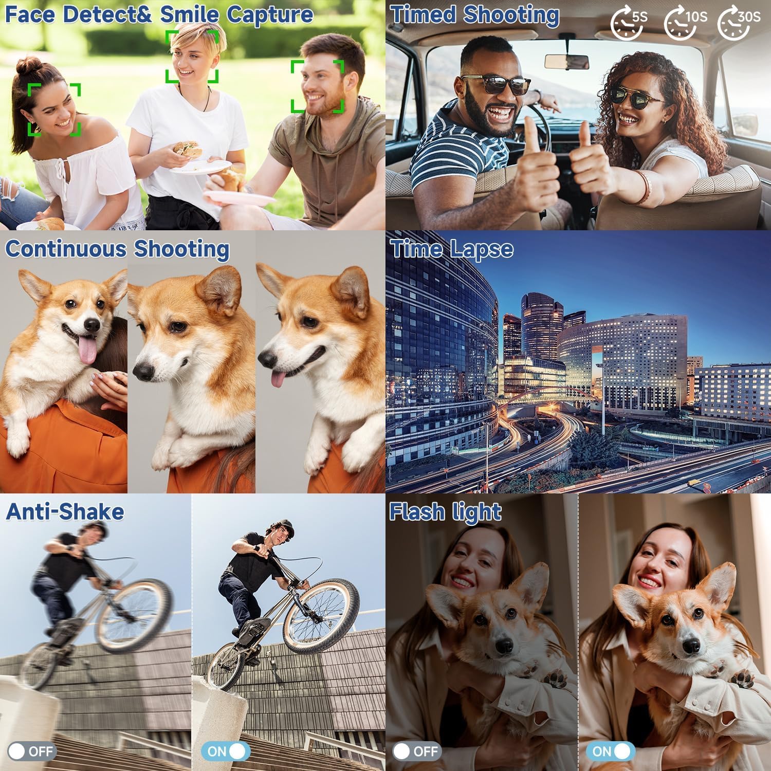 【Autofocus Camera for Photography】:Half pressing the camera button to focus automatically, enabling you to capture detailed close-up shots or distant objects. The camera for photography also supports self-timer, continuous shooting , 22 special Filters, Loop recording, anti-shake, beauty, smile capture and macro shooting, creating the creativity you want!