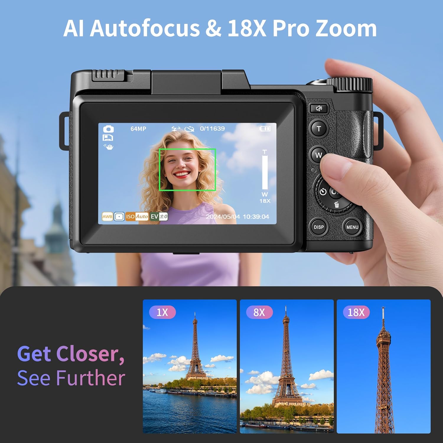 【18X Pro Zoom & AI Autofocus】: Capture stunning details from afar with powerful 18X digital zoom, ideal for landscapes and close-ups. Advanced autofocus delivers instant, razor-sharp clarity, even with moving subjects or in low light. This point-and-shoot digital camera makes pro-quality photography simple, with every shot crisp, vibrant and perfectly focused, Your Perfect Vlogging Partner!