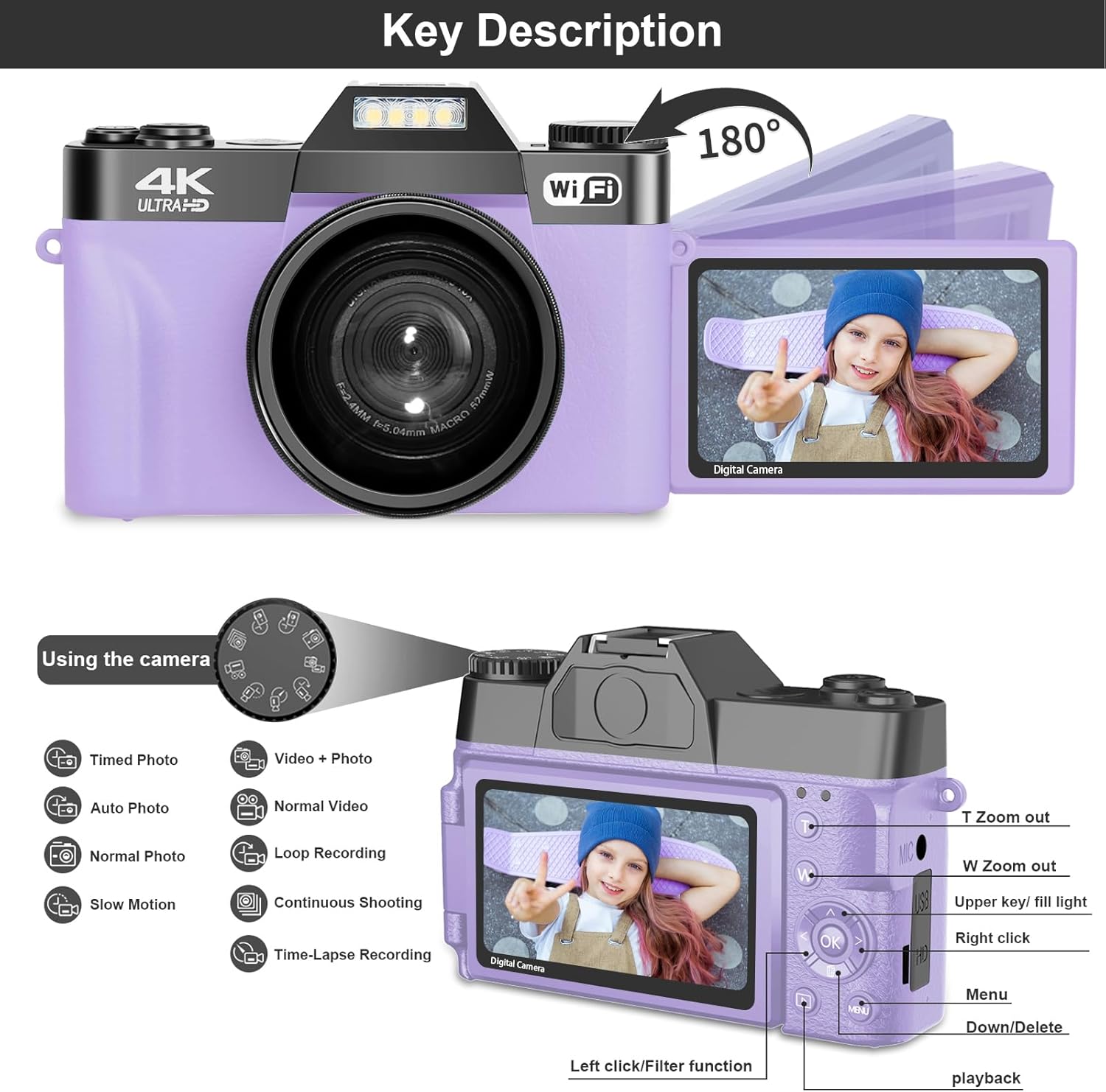 【Wide Angle & Macro Lenses】The 4K camera comes with a 52mm detachable wide-angle and macro lens, perfect for capturing vast horizons and tiny details. Use manual focus for sharp 4K photos. Easily switch between modes like video, time-lapse, and more using the top knob