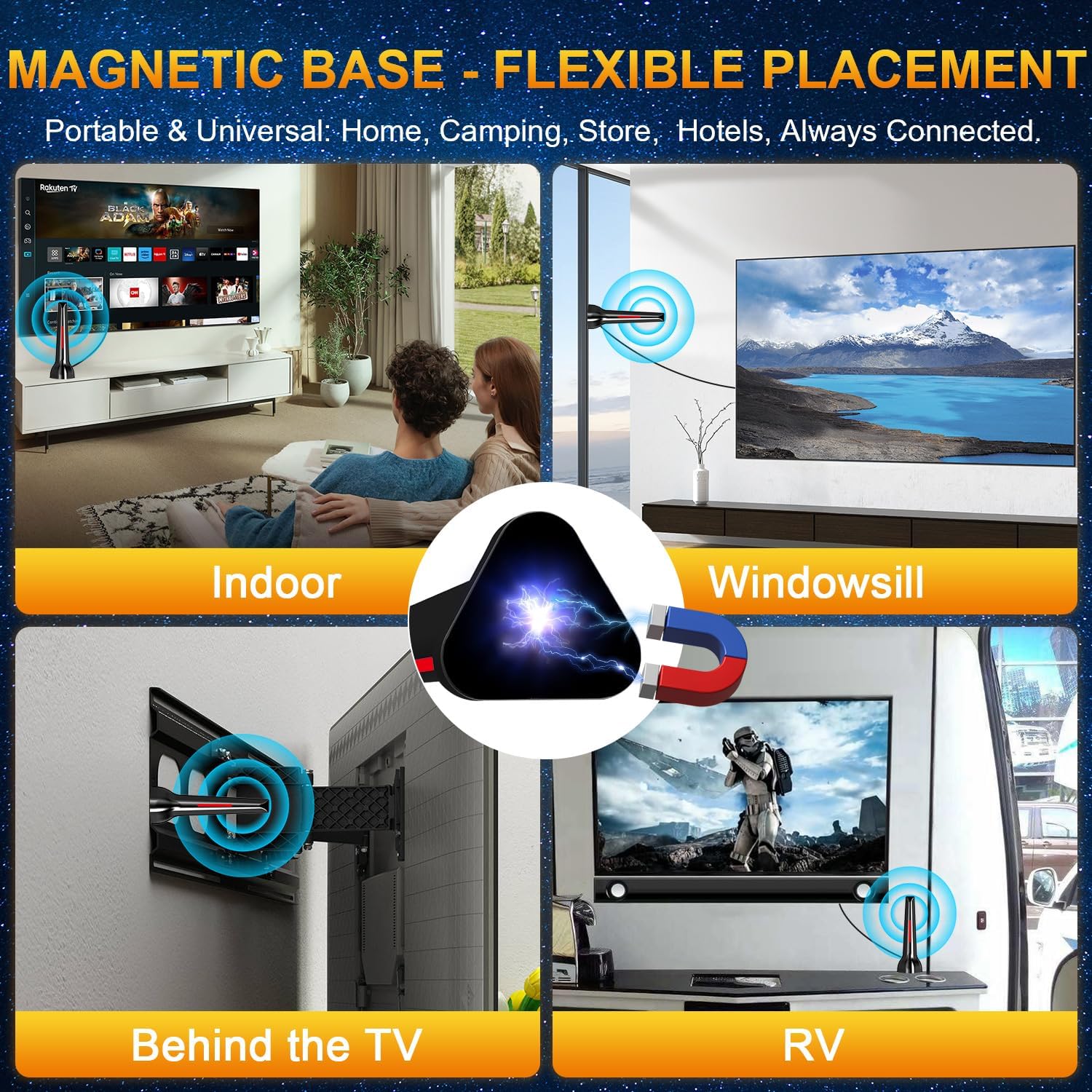 𝟑𝟔𝟎° 𝐑𝐞𝐜𝐞𝐩𝐭𝐢𝐨𝐧 & 𝐌𝐚𝐠𝐧𝐞𝐭𝐢𝐜 𝐁𝐚𝐬𝐞 : DTB TECH tv indoor antenna for local channels supports 360° omini-directional reception. With its powerful magnetic base, this 4K HD digital antenna for smart tv indoor installs effortlessly on any metal surface —like your TV stand or desk