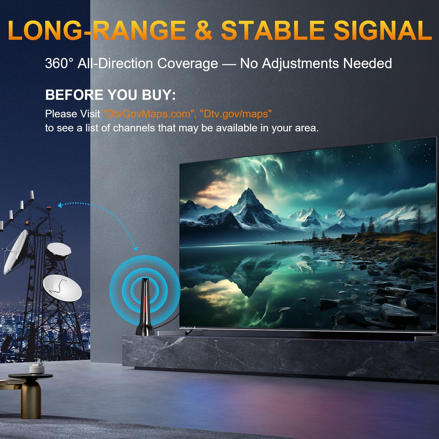 𝐆𝐮𝐢𝐝𝐚𝐧𝐜𝐞 𝐍𝐨𝐭𝐞𝐬 : Please read the instructions before use. Reception range of our local channel antenna for smart tv indoor is about 120 miles, but reception varies by location, terrain, and weather. For the optimal results, try placing your antenna in different locations to find the optimal signal. ( NOTE : After moving your tv antennae indoor, always re-scan for channels on your TV. To see what’s available in your area, check “DTV.gov/maps” )