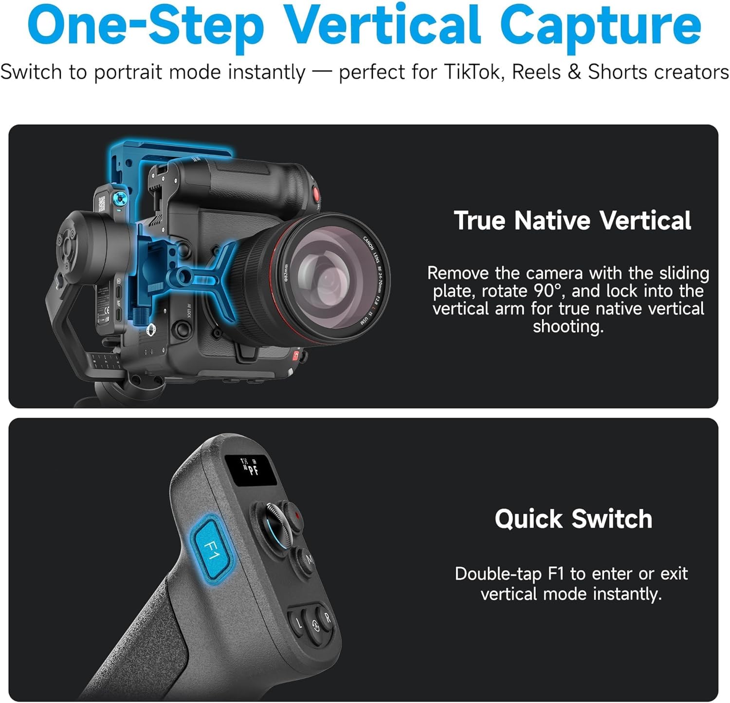 Seamless Vertical Shooting with This Camera Gimbal : Switch between horizontal and native vertical shooting instantly. This gimbal stabilizer for camerasis designed for full-resolution social media content, requiring no extra accessories