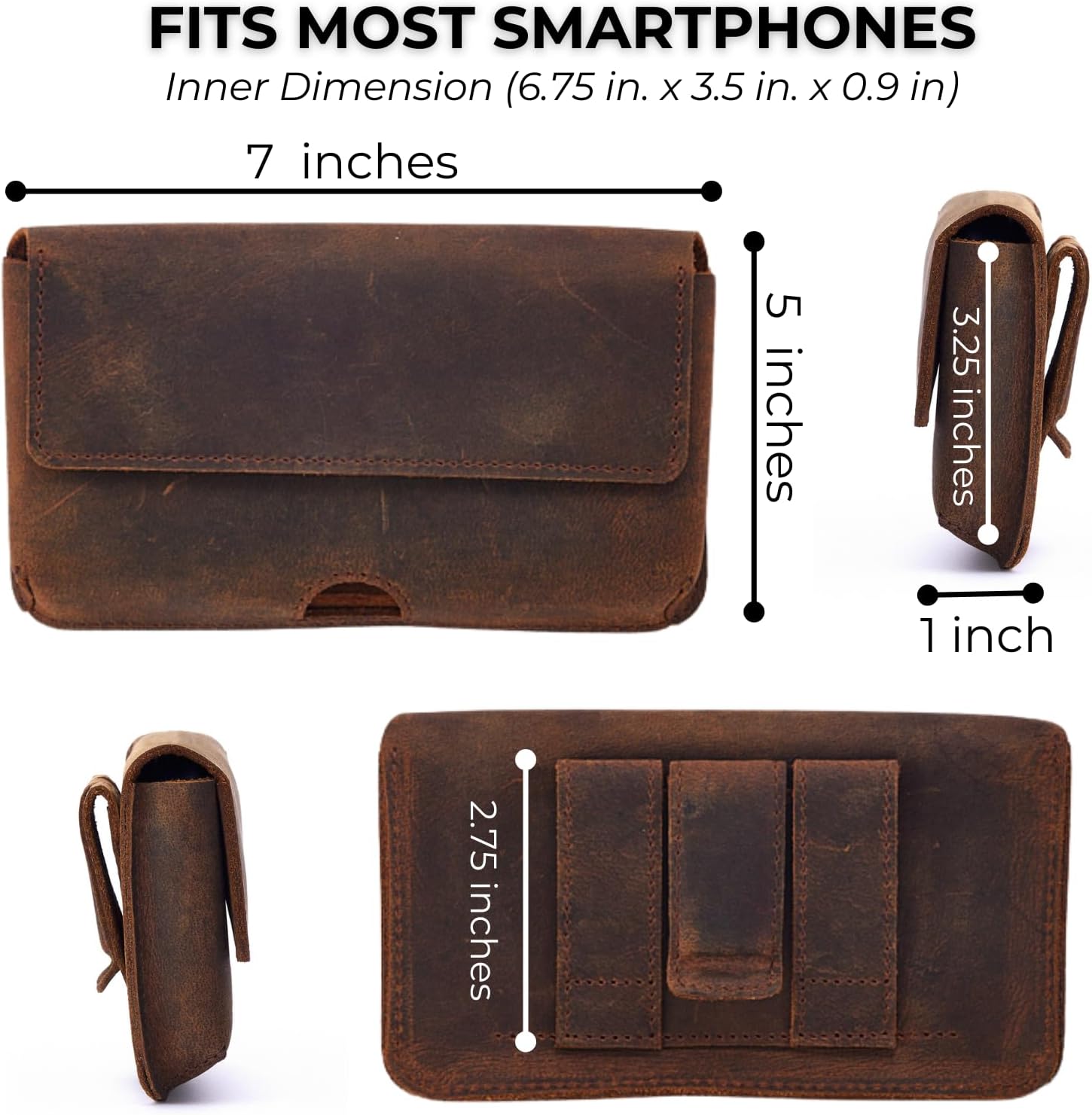 Premium Quality Leather Cell Phone Holster – Expertly handcrafted from 100% genuine leather, this durable cell phone holster case provides a perfect fit for iPhone models including iPhone 16, 16 Pro, 15, 15 Pro, 14, 14 Pro, 13, 13 Pro, 12, iPhone 12 Pro (2020), XS, X, iPhone 11, and iPhone XR (2018), even with your phone case on. The interior dimensions are 7″ x 5″ x 1″, ensuring a snug and secure fit for your device while offering reliable protection.