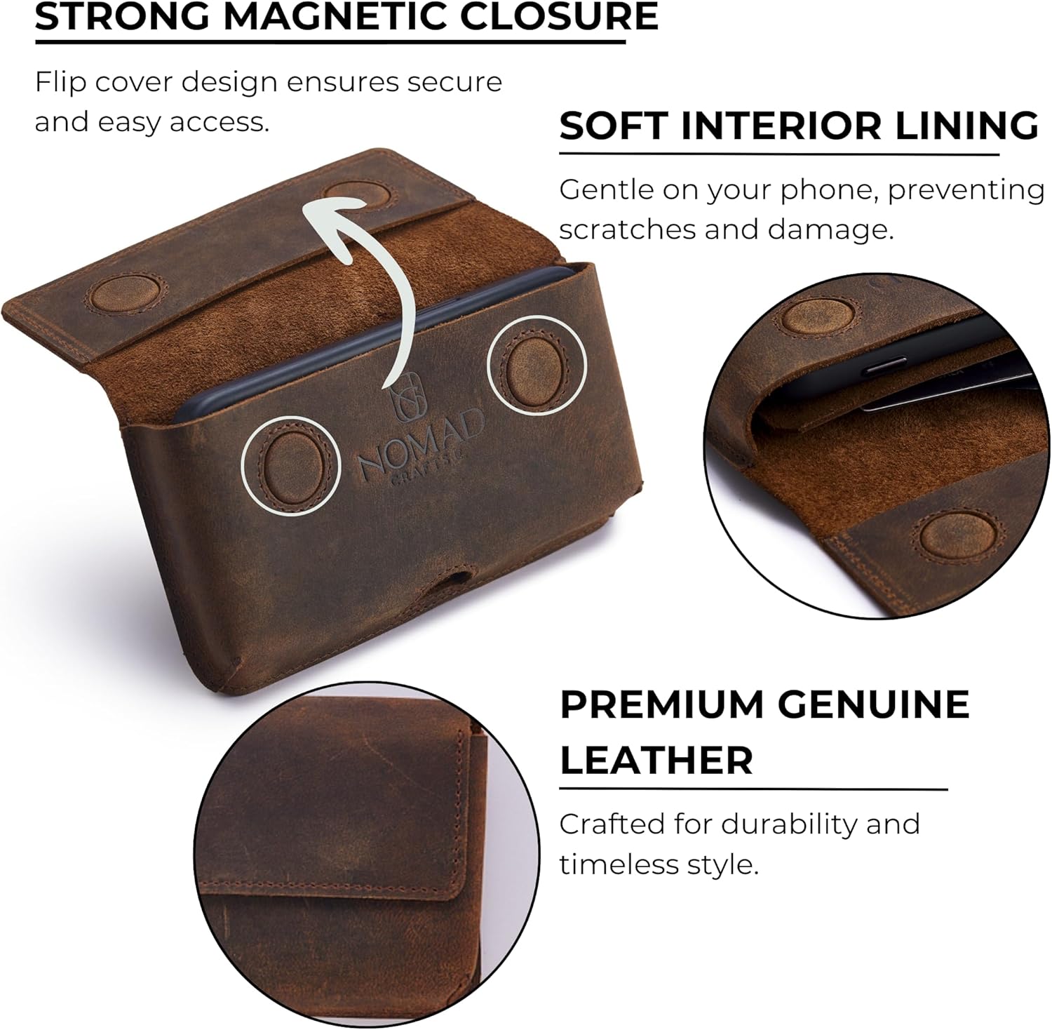 Leather Phone Holster with Convenient Card Holder – This leather phone holster features a built-in card holder with a magnetic closure, providing easy access to your essential cards. The front slot keeps your cards secure and accessible, while the strong magnetic flap ensures that nothing falls out, giving you both functionality and peace of mind on the go.