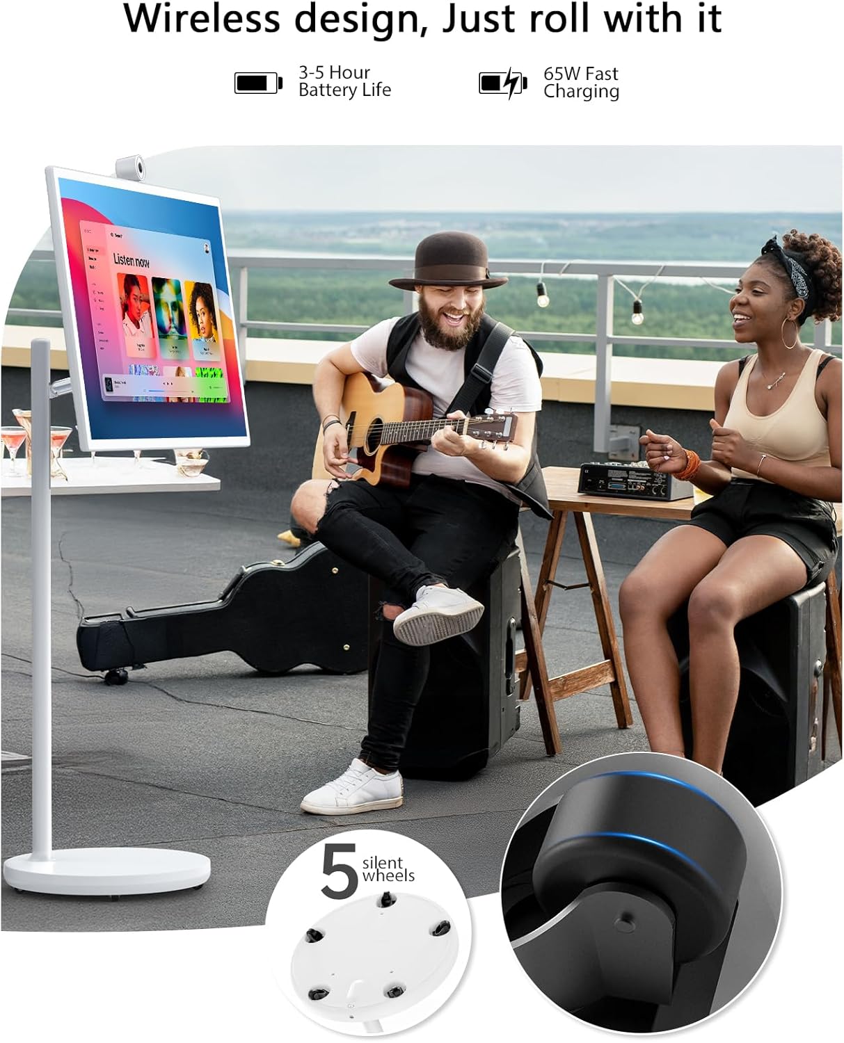 Ultimate Viewing Comfort Meets Total Mobility – Freely landscape can be adjusted to different angles by rotating and tilting as needed. GFF monster portable screen allows you to comfortably watch videos anywhere. Wireless portable design – Five wheels in the base allow you to easily move it freely to any areas of your home, whether it’s the living room, kitchen, bedroom,or even outdoors. Built-in battery provides 3-4 hours of usage time, allows you to entertain or work anytime and anywhere.