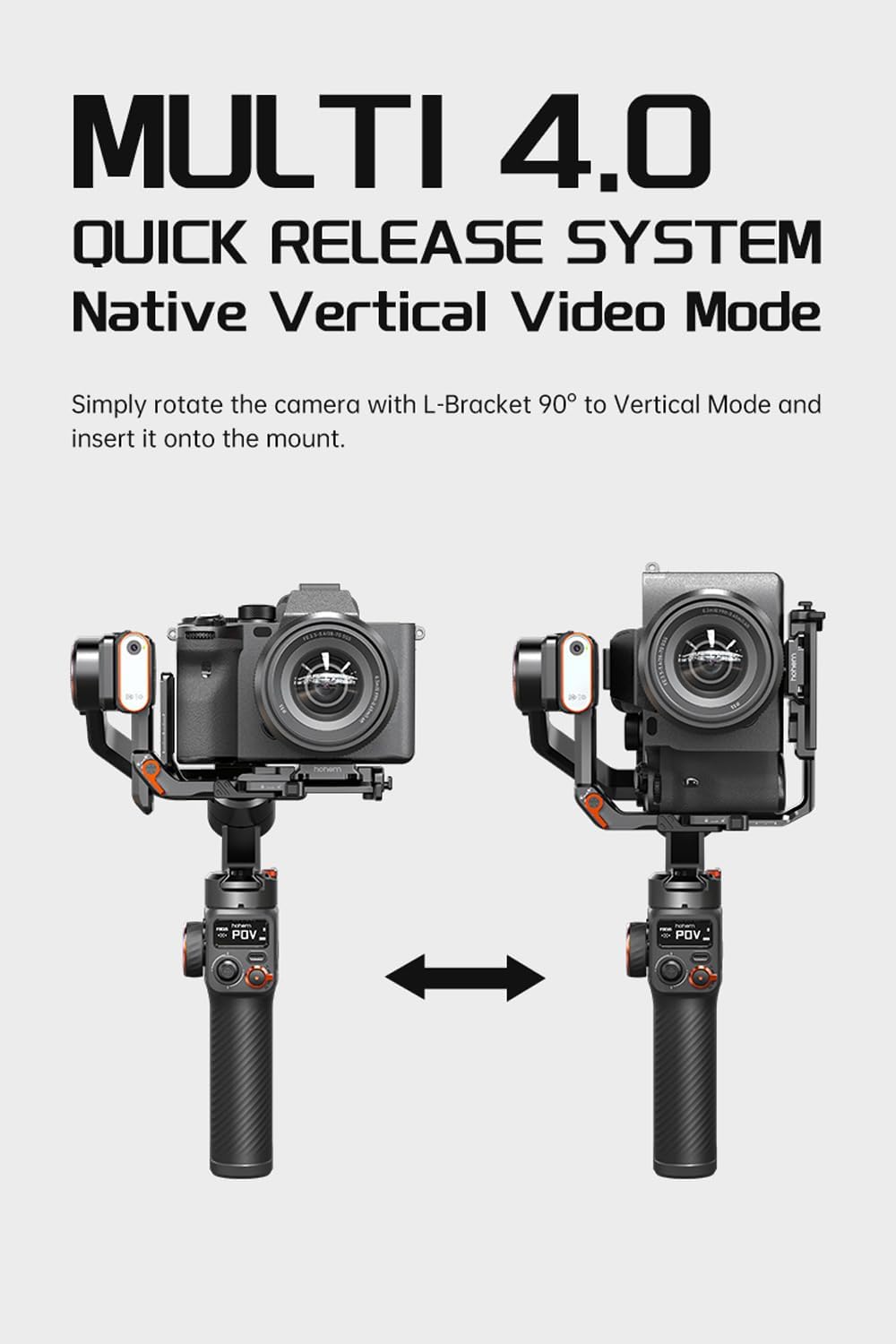 【MULTI 4.0 QUICK RELEASE SYSTEM】Provide greater universality and facilitate easy switching between various photography accessories. Easily control photo and video via cable control or Bluetooth control. Simply rotate the camera with L-Bracket 90° to Vertical Mode and insert it onto the mount.