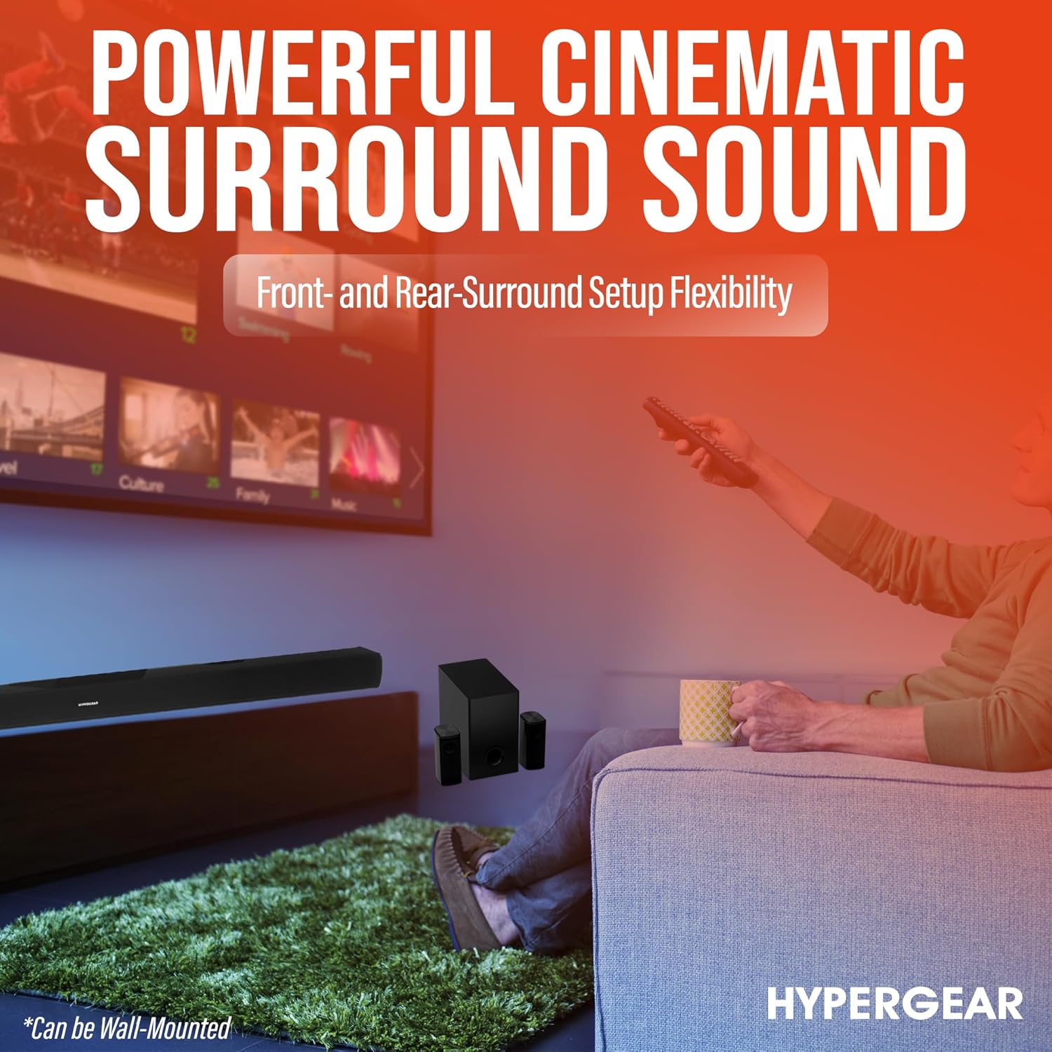 EASY SETUP & INCLUSIONS: Quickly set up your wireless surround sound system for TV with the included wall-mounting hardware and full-function remote. The package includes a 38” ultrawide quad-driver soundbar, dual wired satellite speakers, 5.25” front-firing subwoofer, wall-mounting hardware, and a full-function remote for comprehensive audio coverage.”