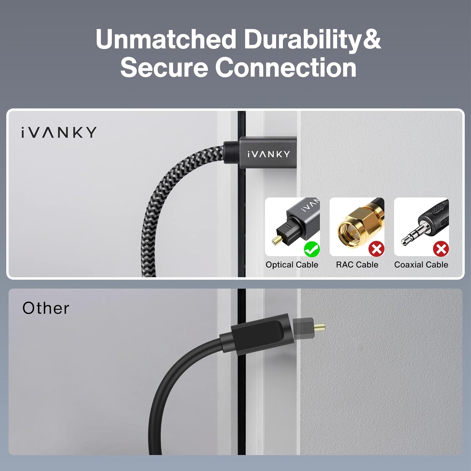 【Extra-Long 10ft Cable for Flexible Setup】iVANKY 10ft optical audio cable provides just the right length to connect your devices comfortably – no more struggling with cables that are too short. Enjoy the same pristine, lossless audio quality while having the freedom to arrange your home theater, gaming system, or audio components exactly how you want