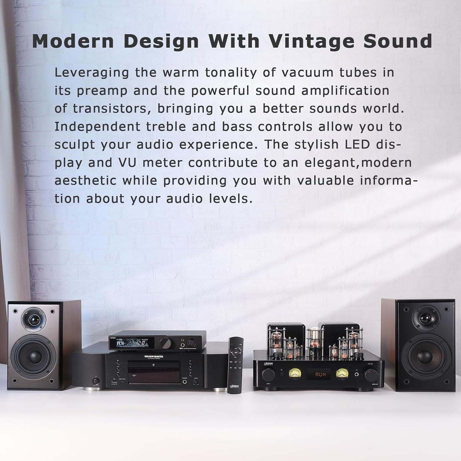 Vacuum Tubes Preamp & Transistor Power Amplify: Leveraging the richness of vacuum tubes preamp and the robustness of transistor power amplify, this tube amplifier brings you great sound reproduction, well balancing warmth and clarity.