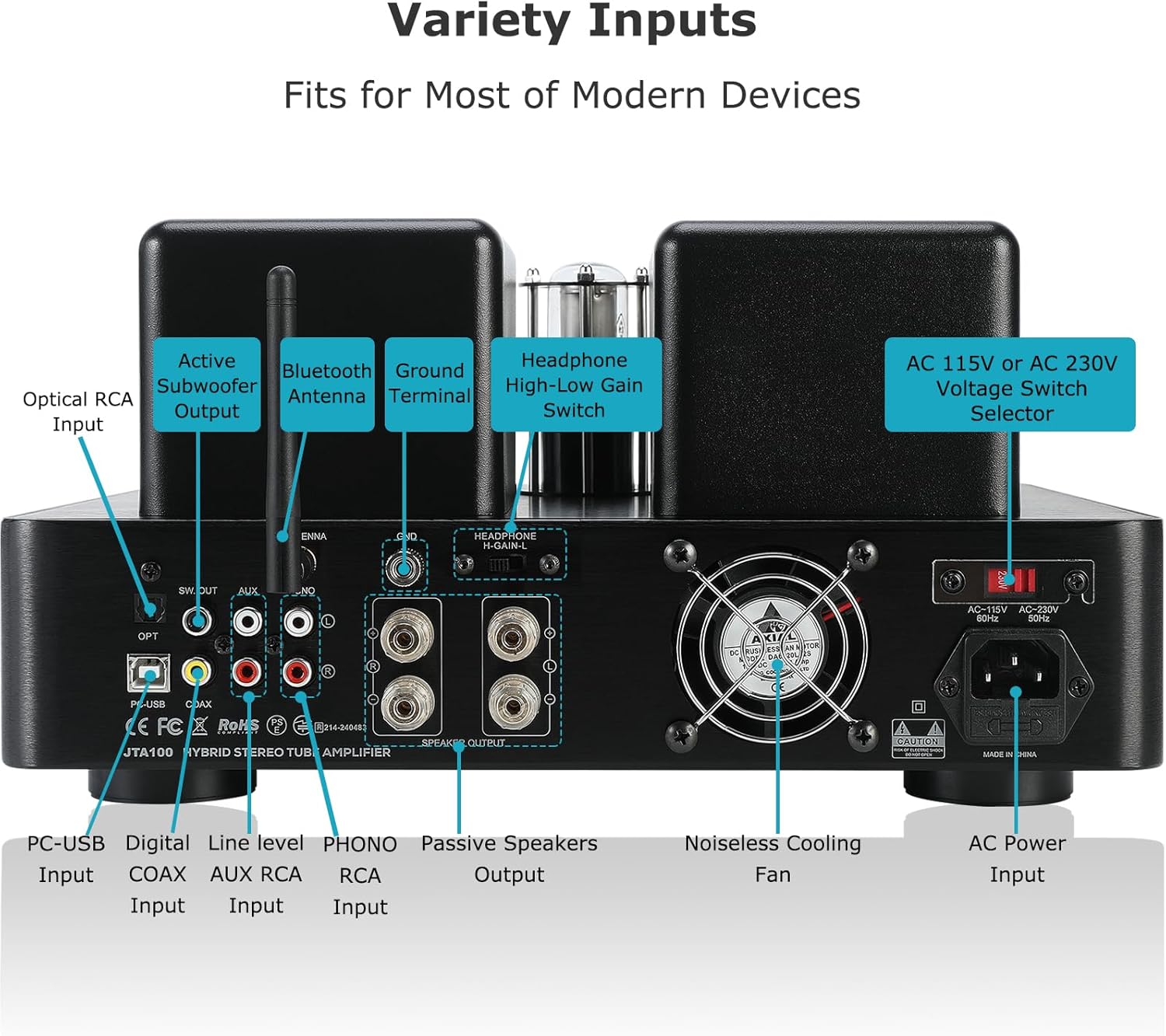 Versatile Inputs & Outputs: This entry-level HiFi amplifier supports multiple inputs including AUX, COAX, PHONO, OPT, and BT 5.0. It has a headphone output and a subwoofer output, enhancing its versatility and adaptability for various audio setups. A Remote provides controlling from a distance.With high-low gain headphone output switch,the JTA100 amplifier can drive 16-600 ohms headphone easily with rich detail and clarity.