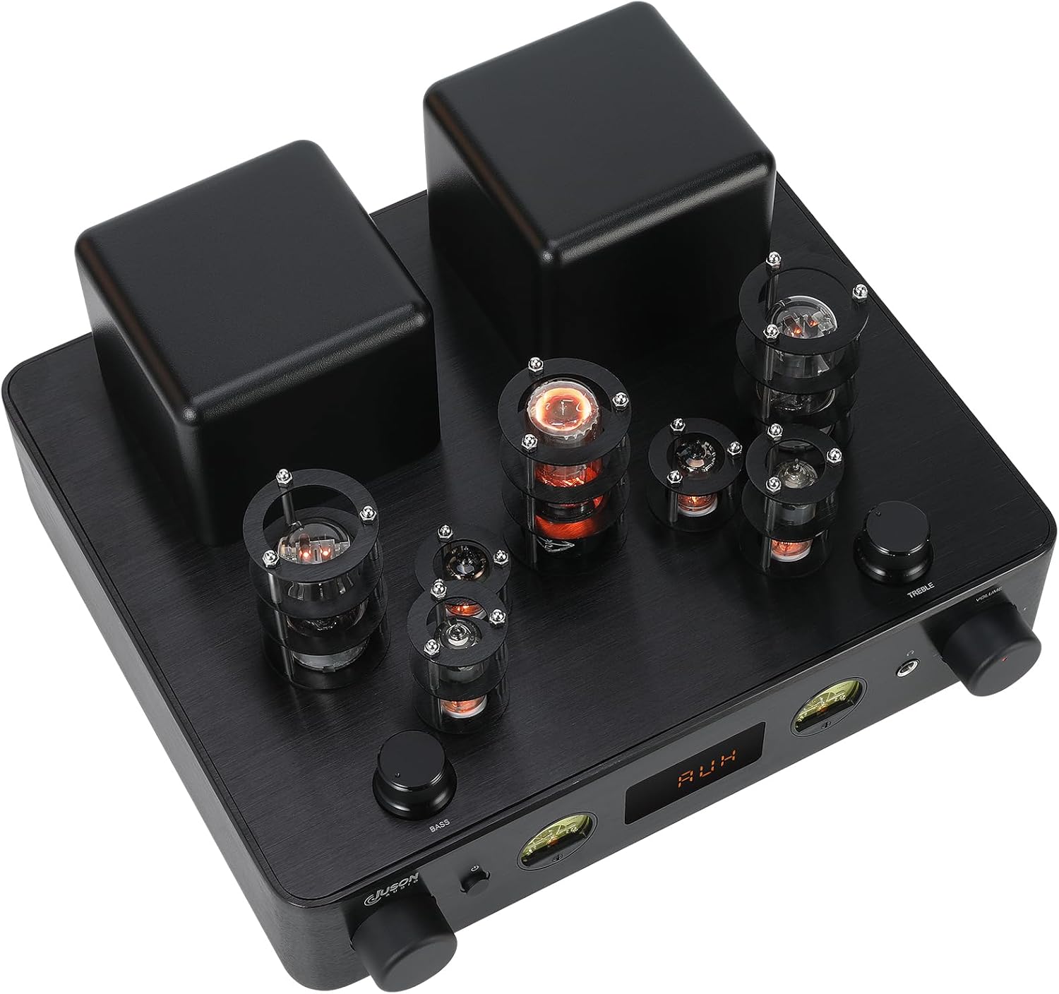 Class A/B vacuum tube amplifier perfect matching with most of home audio systemsImpressive 200Watts RMS output provides a vibrant and captivating high-grade soundsProfession tune turning for a great,cheerful and warmth soundSupports multiple inputs including MM phono,Coax, Optical, AUX, BT 5.0, and PC-USB driveSubwoofer,passive speaker and headphone outputs efficiency provide much warmth and natural sound.The tubes will be a little bit high temperature when they work,please don’t touch them.Built-in phono preamplifier,it can connect MM phono directly.Modern blue tooth connectivity can stream your favorite music into amplifier easily.An IR remote is provided,you can control the amplifier from a distance.The remote does not include battery,if you found the remote unworkable,please check if you have put the battery in.The stylish LED display and VU meter contribute to an elegant, modern aesthetic.The VU meter would move even the headphone plug in or volume is around half.With high-low headphone gain switch,it can fit for 16-600 ohms headphone.RCA inputs and subwoofer output combine a 2.1CH surrounding environmentA headphone output for immersing listening experienceIndependent bass and treble button for private favourite matching listeningEnjoy a rich and natural sound music