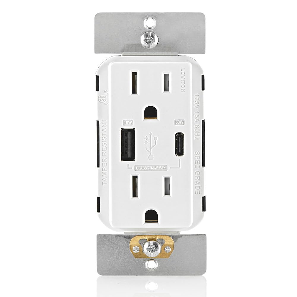 15 Amp, 125 Volt, Decora Tamper-Resistant Outlet. NEMA 5-15R, 60W (20V@2.5A+ 5V@2A), Dual Type A/Type-C Power Delivery USB Charger, Grounding, Wire Leads – White