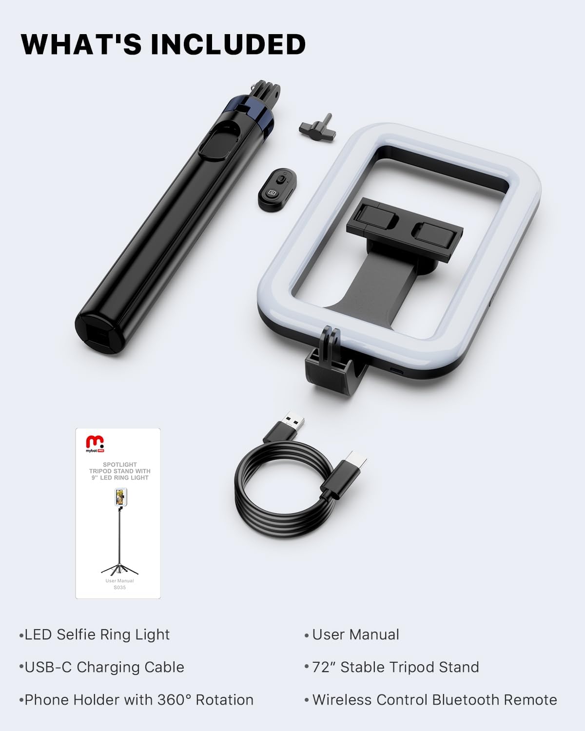 The M MYBAT PRO Selfie Ring Light with 72″ Tripod Stand package includes: Complete Setup: 72″ stable tripod stand (extends from 12″ to 72″) LED selfie ring light with square design Phone holder with 360° rotation Wireless Bluetooth remote control USB-C charging cable