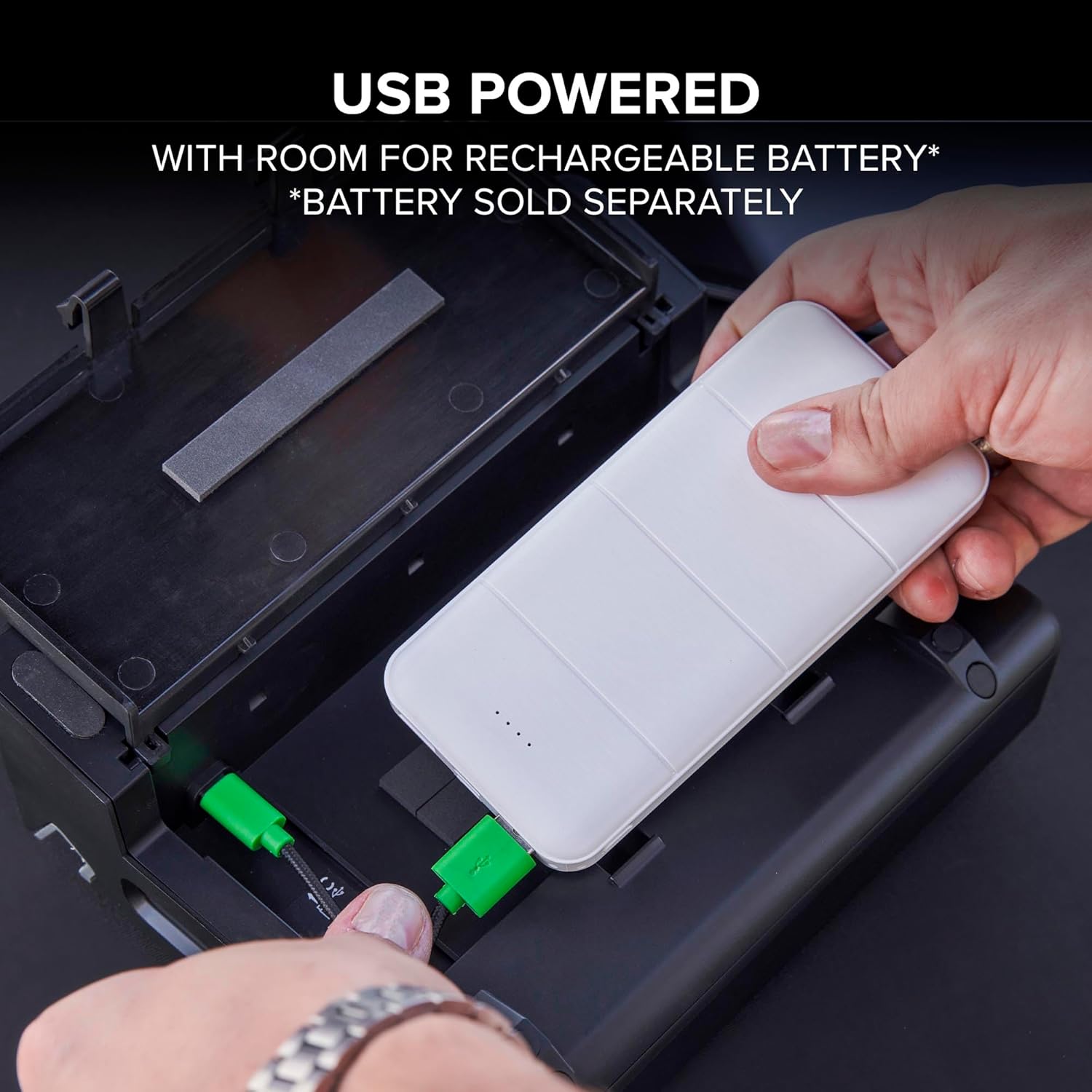 Finally a real mixer you don’t have to plug in. Just connect a USB battery pack, stash it in the storage compartment, and you can track and stream for hours, far away from an outlet.