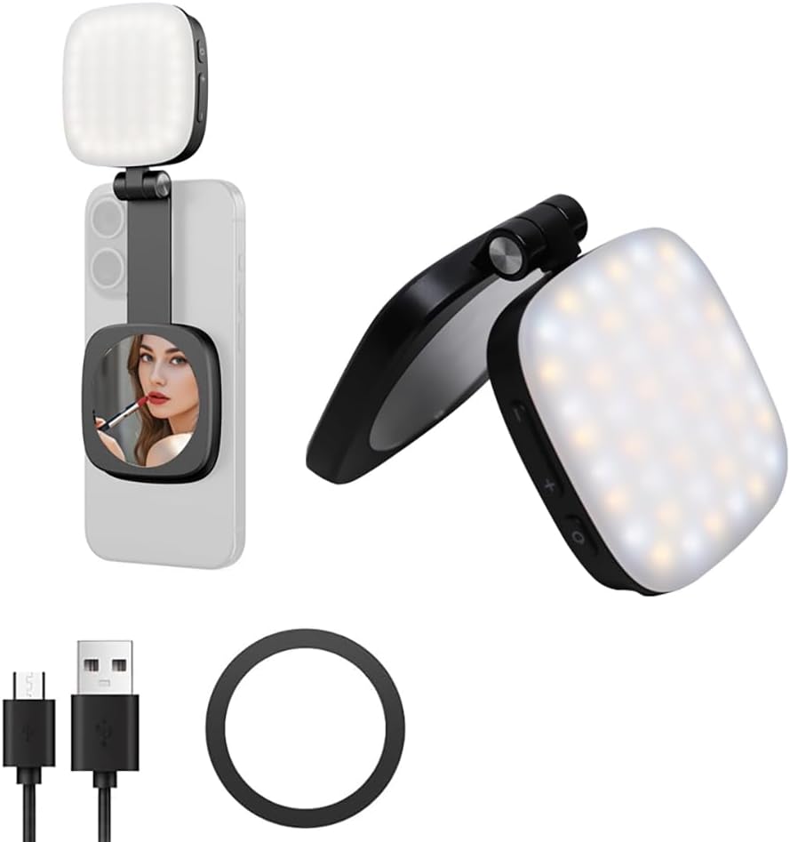 【Built-in HD Makeup Mirror】This phone fill light features a 56mm HD makeup ,can be used with the fill light , allowing you to quickly touch up your look on the go — whether it’s a quick grooming check, reapplying lipstick during your commute, or fixing your hair before taking a selfie. It helps you look your best anytime, anywhere. Note: Please remove the protective film before using the mirror.
