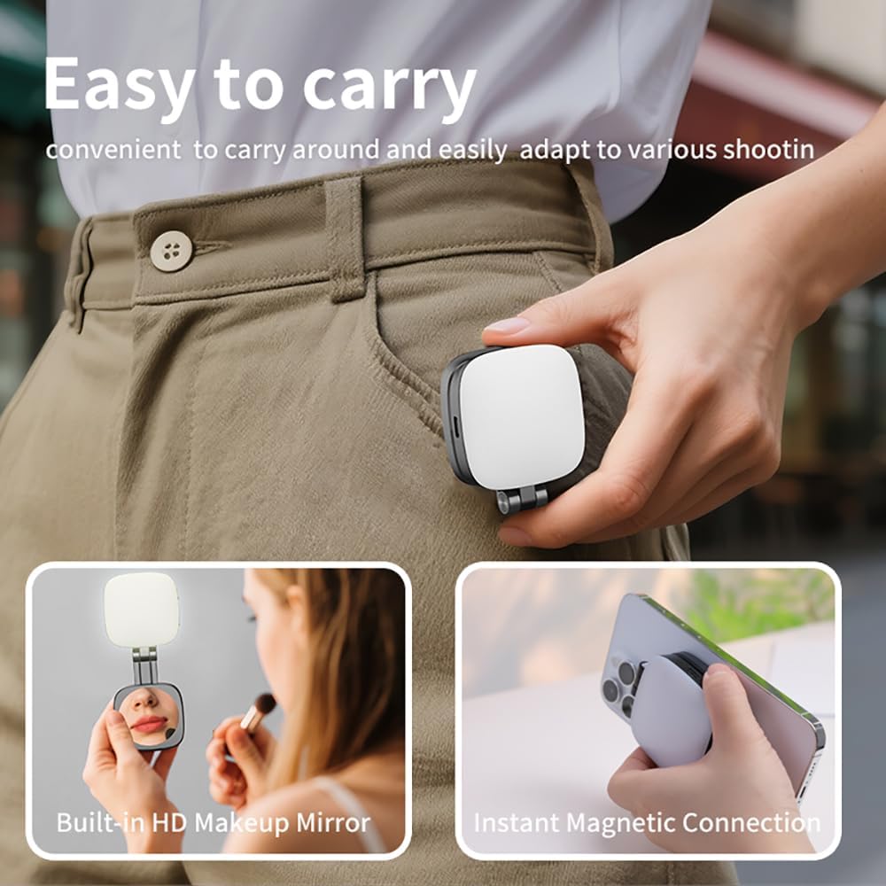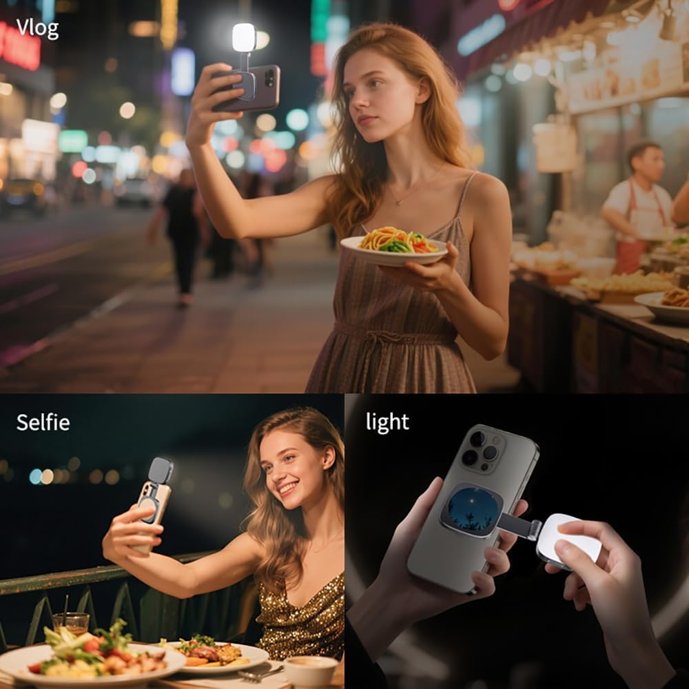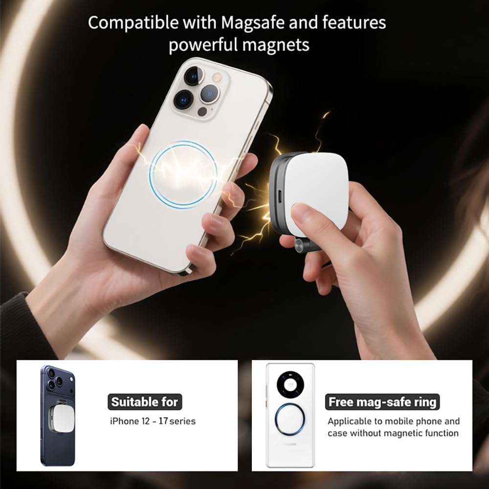 【Instant Magnetic Connection】This portable Magnetic phone fill light compatible with Magsafe and features powerful magnets to ensure a secure hold on your phone during shooting. It provides seamless magnetic connectivity for iPhone 17/16/15/14/13/12 series. For non-magnetic devices, the included adhesive magnetic ring allows for easy attachment to Android phones,laptops,or other devices.