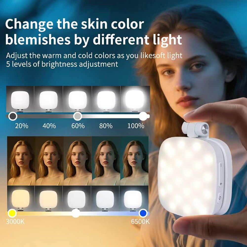 【5 Color Temperatures & 5 Brightness Levels】Equipped with 48 premium LED beads, this 3-in-1 magnetic beauty selfie light features a CRI95 ultra-high color rendering index and professional-grade brightness of 700lx at 0.3m. It improves skin tone and reduces shadows. With physical buttons, you can easily switch between 5 precise color temperatures (3000K-6500K) and 5 adjustable brightness levels (20%-100%). Perfect for selfies, photography, video recording, video conferences, and social media vlogging.