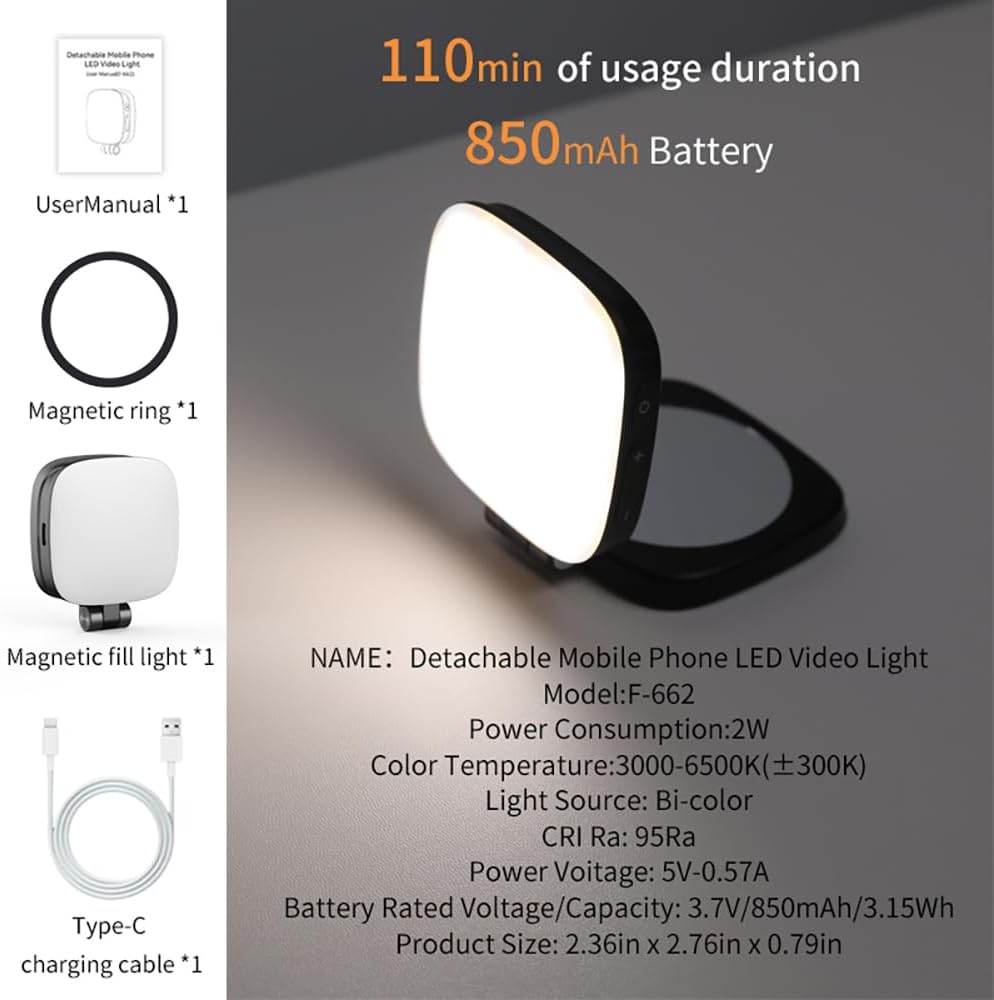【Extended Battery Life & Fast USB-C Charging】This compact magnetic selfie light features a high-capacity 850mAh built-in battery, delivering up to 110 minutes of continuous use at 100% brightness. It supports fast USB-C charging and can be fully charged in just 150 minutes. The pass-through charging function allows you to keep using the light while plugged in, ensuring uninterrupted lighting whenever you need it.