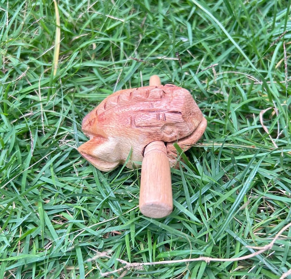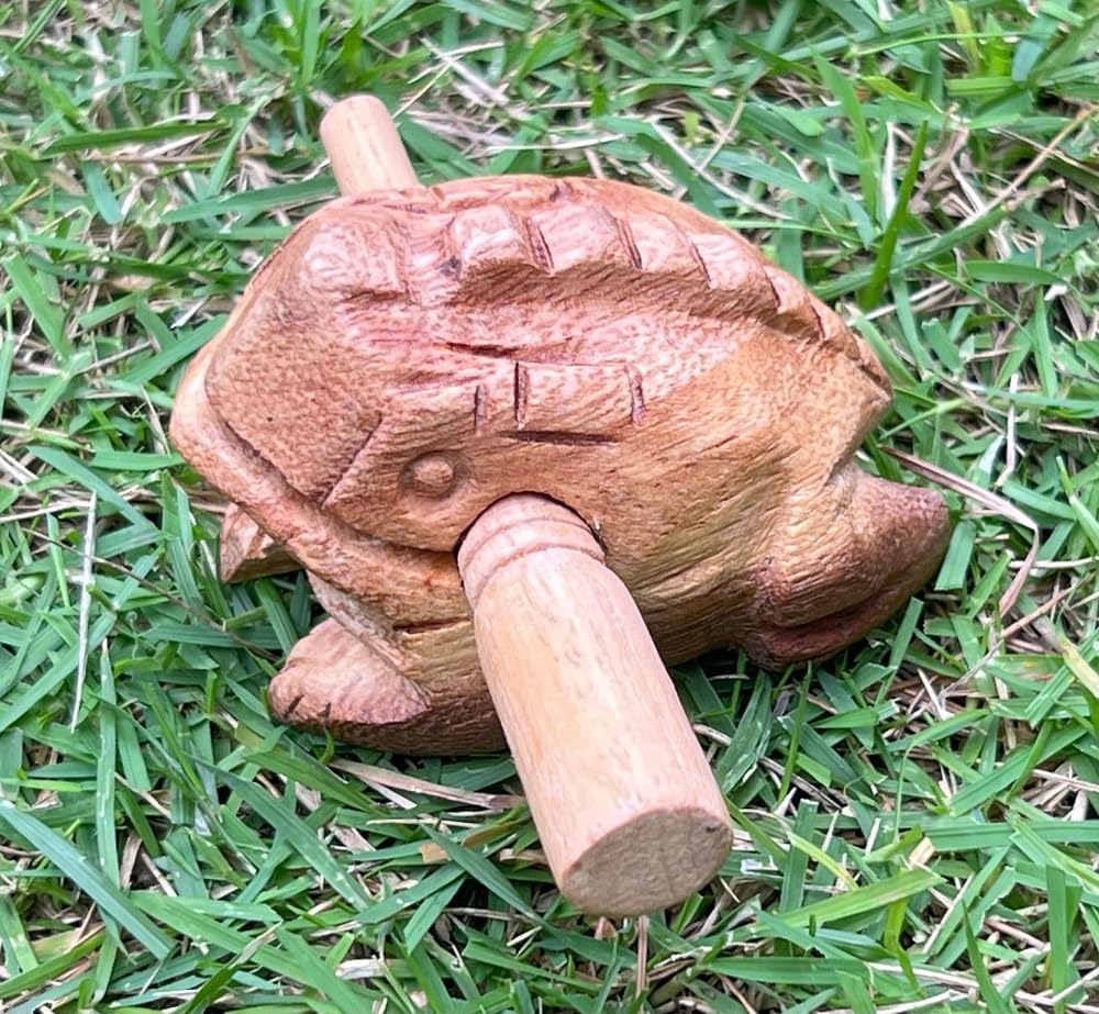 Frog – Rubbing its spine with the wooden stick up and down motion producing realistic croaking sounds, the frog is the high pitch of the sound is produced.