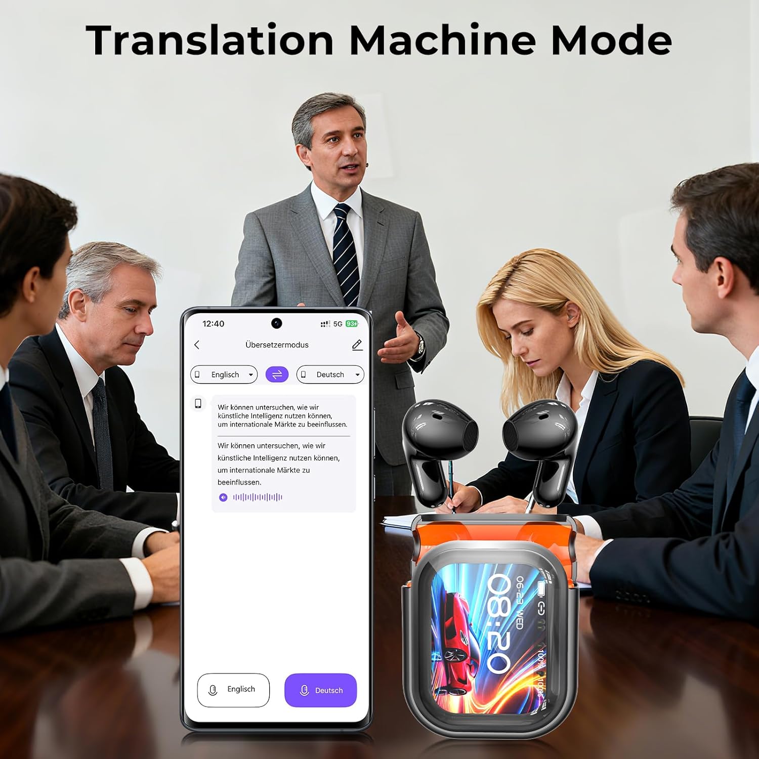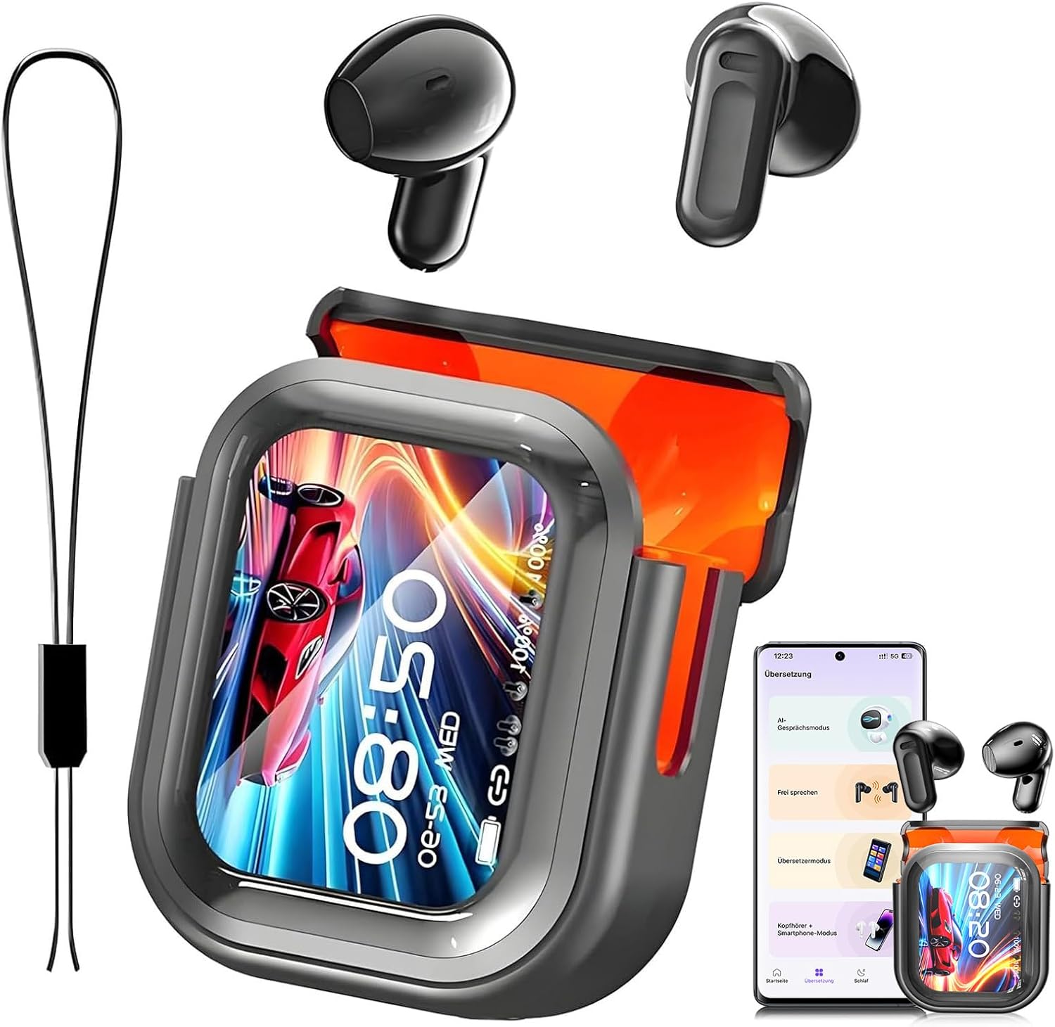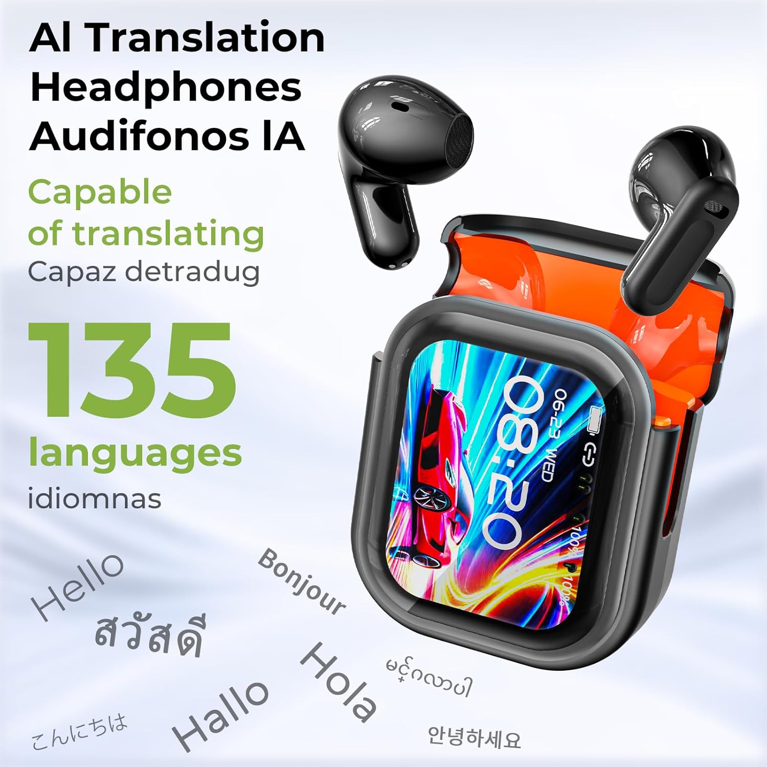 [LCD Smart Touch Screen Charging Case] The translating headphones feature a sleek, high-definition LCD touchscreen that lets you control over 15 functions directly from the earbuds, including music playback, an equalizer, language selection, voice assistants, camera control, and an anti-loss feature, all with simple swipes and taps — completely operable without a smartphone