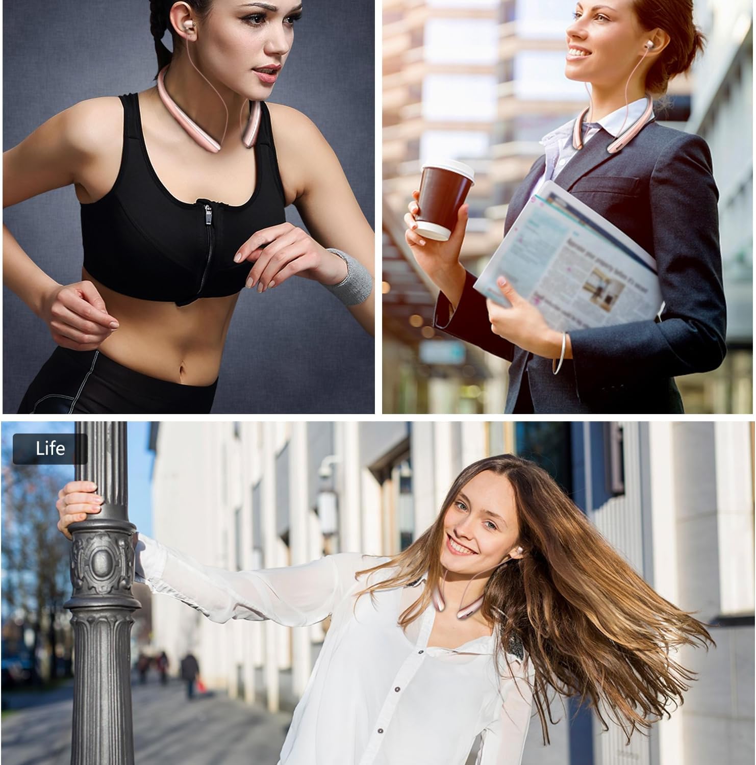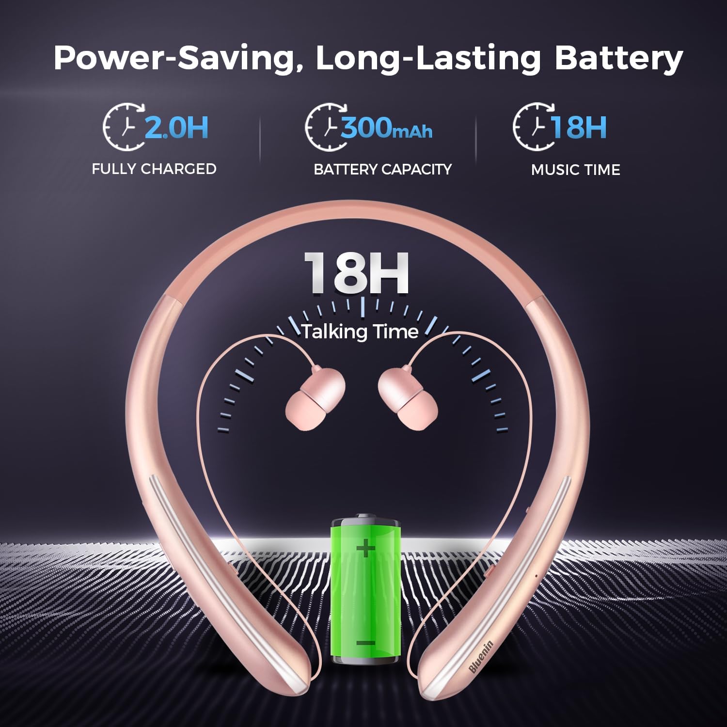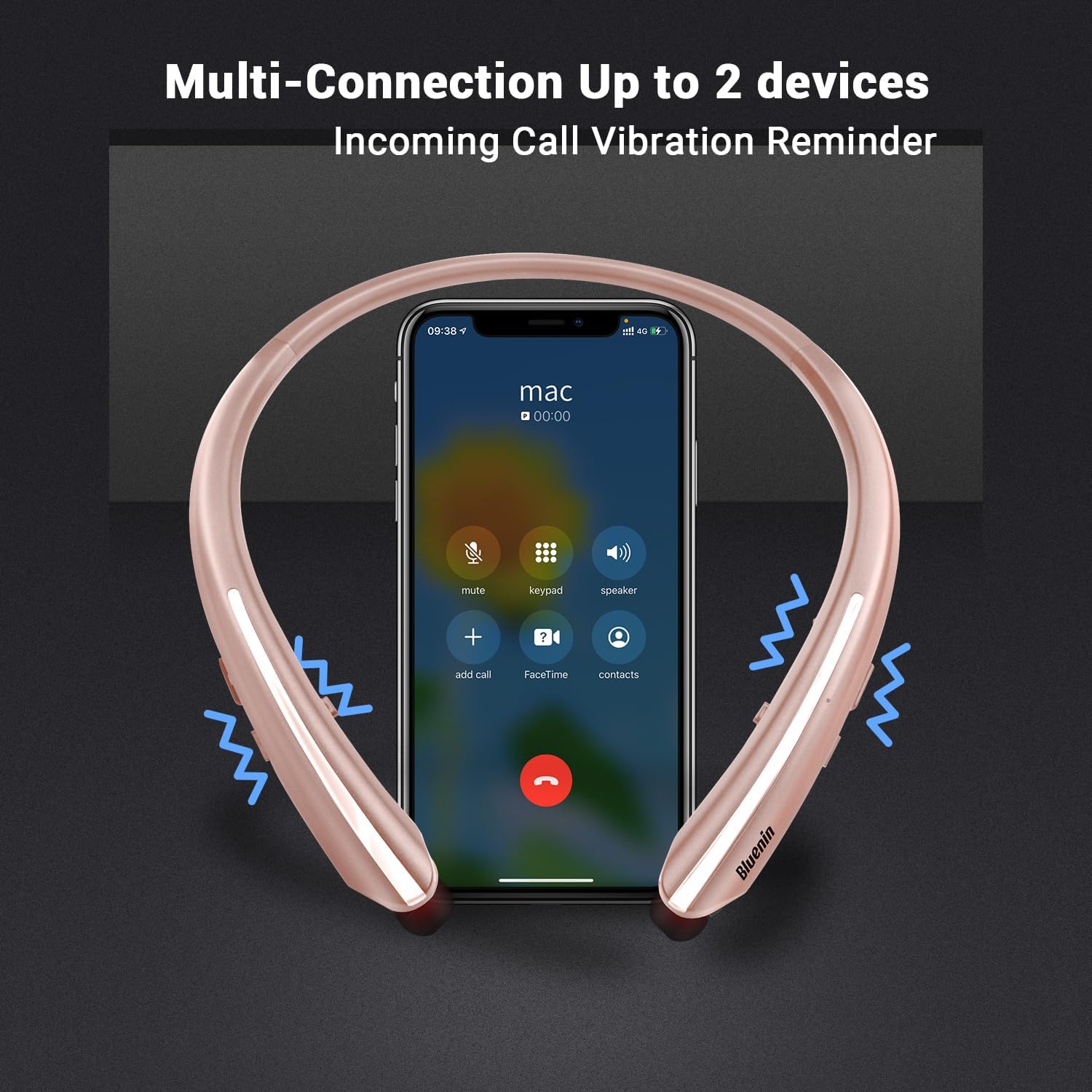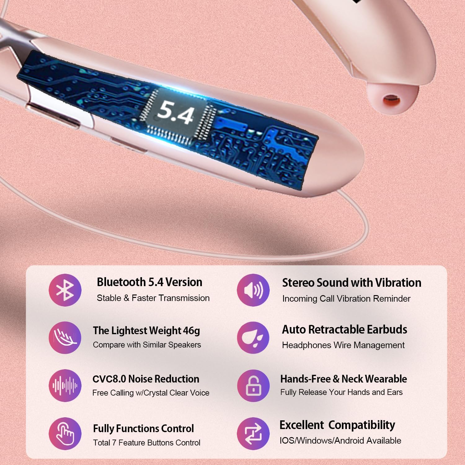 Bluetooth 5.4 technology with advanced CSR8645 chips & CVC8.0 noise cancelling technology can filter out background noise.Auto retractable earbuds allows you to pull the retractable wire to the length you want.Ergonomic Neck-Behind provides a comfortable, curved fit through all-day wear and use.Premium silicone gel surface is sweat-proof for stable wearing. Ideal for Gym, running, hiking and other outdoor activities.Bluetooth Headphones with Hi-Fi Stereo Sound & Voice Prompt and Vibration & Long battery life